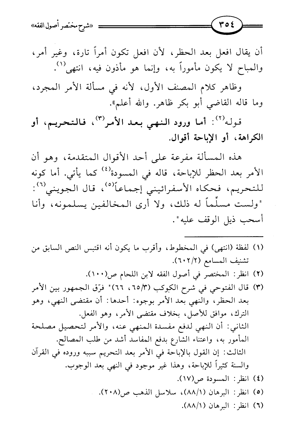 قوله (¬2): أما ورود النهي بعد الأمر (¬3)، فالتحريم، أو الكراهة، أو الإباحة أقوال.