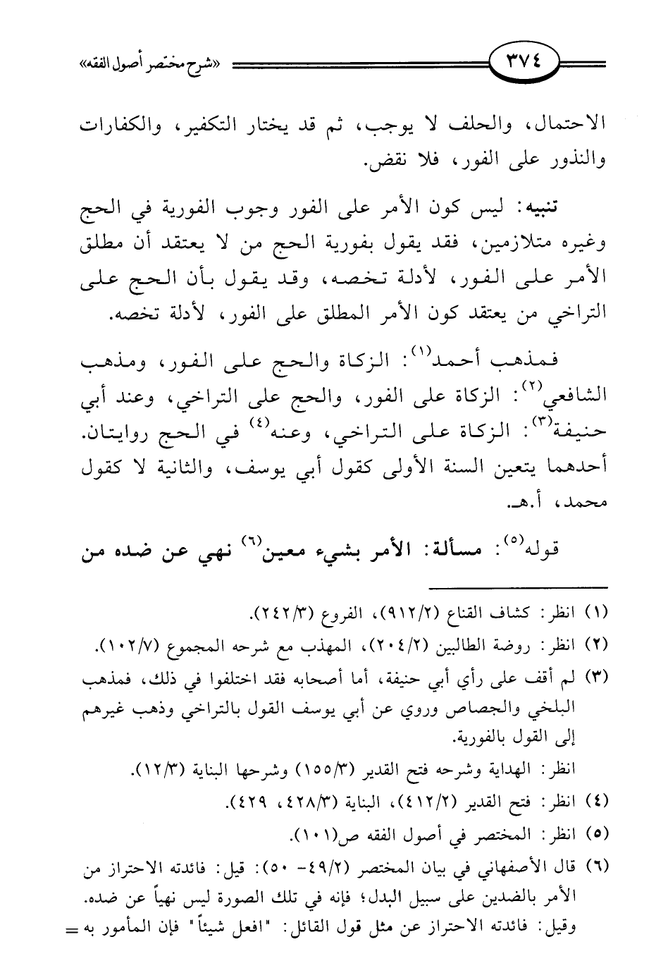 (¬3) لم أقف على رأي أبي حنيفة، أما أصحابه فقد اختلفوا في ذلك، فمذهب البلخي والجصاص وروي عن أبي يوسف القول بالتراخي وذهب غيرهم إلى القول بالفورية.