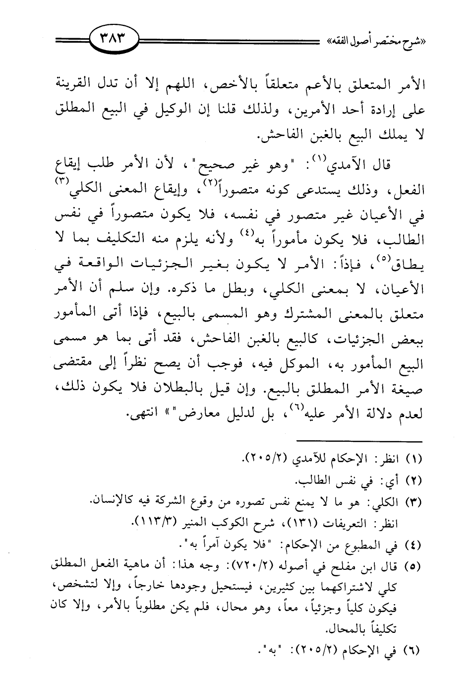 قال الآمدي (¬1): "وهو غير صحيح"، لأن الأمر طلب إيقاع الفعل، وذلك يستدعى كونه متصورًا (¬2)، وإيقاع المعنى الكلي (¬3) في الأعيان غير متصور في نفسه، فلا يكون متصورًا في نفس الطالب، فلا يكون مأمورًا به (¬4) ولأنه يلزم منه التكليف بما لا يطاق (¬5)، فإذًا: الأمر لا يكون بغير الجزئيات الواقعة في الأعيان، لا بمعنى الكلي، وبطل ما ذكره. وإن سلم أن الأمر متعلق بالمعنى المشترك وهو المسمى بالبيع، فإذا أتى المأمور ببعض الجزئيات، كالبيع بالغبن الفاحش، فقد أتى بما هو مسمى البيع المأمور به، الموكل فيه، فوجب أن يصح نظرًا إلى مقتضى صيغة الأمر المطلق بالبيع. وإن قيل بالبطلان فلا يكون ذلك، لعدم دلالة الأمر عليه (¬6)، بل لدليل معارض" انتهى.