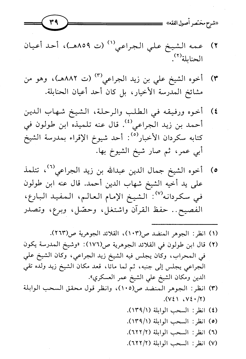 3) أخوه الشيخ علي بن زيد الجراعي (¬3) (ت 882 هـ)، وهو من مشائخ المدرسة الأخيار، بل كان أحد أعيان الحنابلة.