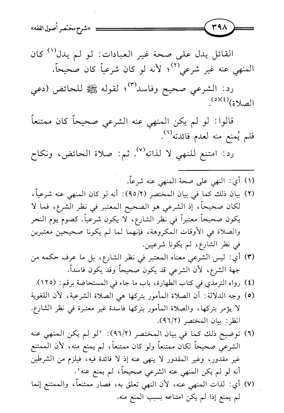 (¬6) توضيح ذلك كما في بيان المختصر (2/ 96): "لو لم يكن المنهي عنه الشرعي صحيحًا لكان ممتنعًا ولو كان ممتنعًا، لم يمنع منه، لأن الممتنع غير مقدور، وغير المقدور لا ينهى عنه إذ لا فائدة فيه، فيلزم من الشرطين أنه لو لم يكن المنهي عنه الشرعي صحيحًا، لم يمنع عنه".