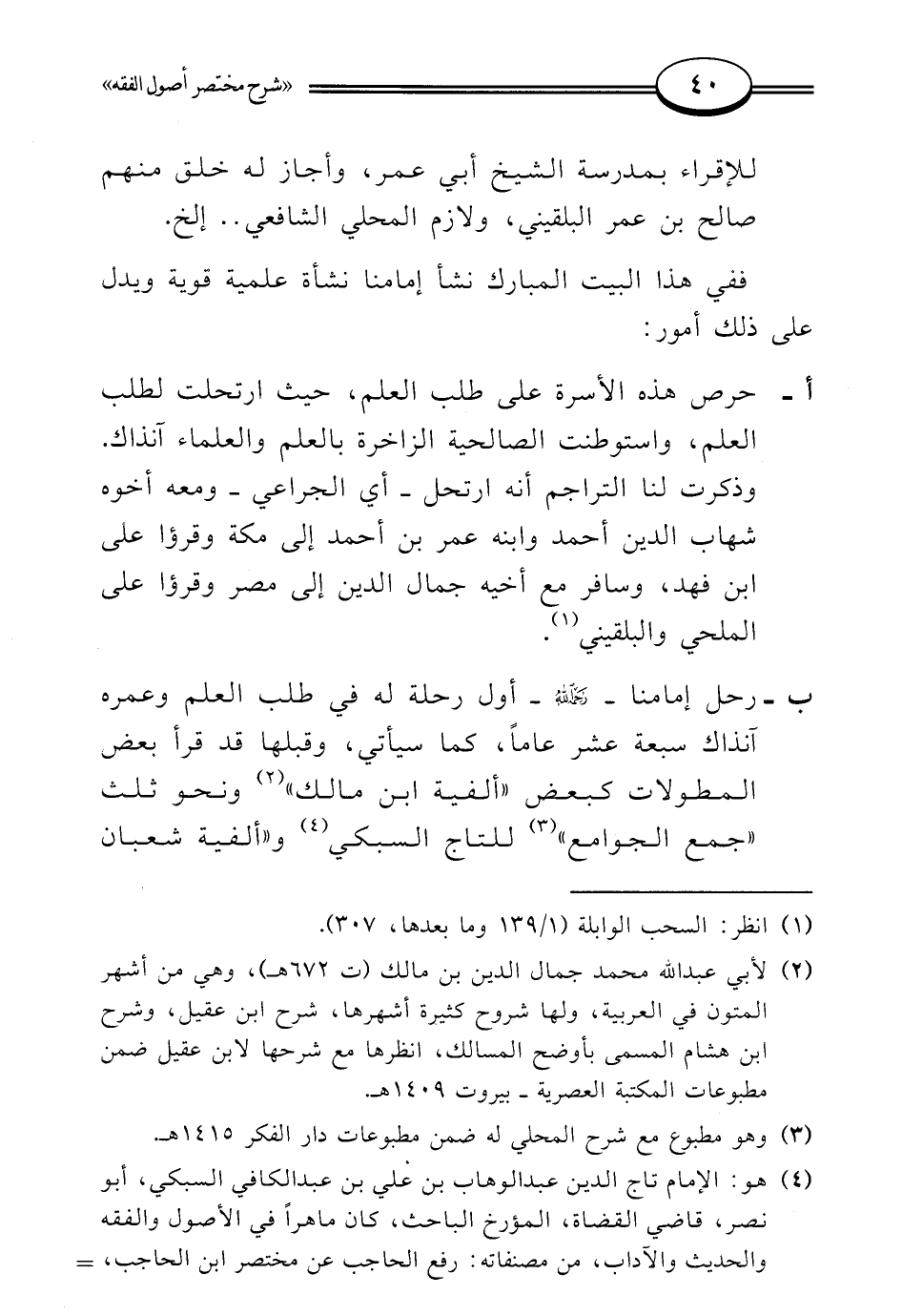 ب - رحل إمامنا - رحمه الله - أول رحلة له في طلب العلم وعمره آنذاك سبعة عشر عامًا، كما سيأتي، وقبلها قد قرأ بعض المطولات كبعض "ألفية ابن مالك" (¬2) ونحو ثلث "جمع الجوامع" (¬3) للتاج السبكي (¬4) و"ألفية شعبان
