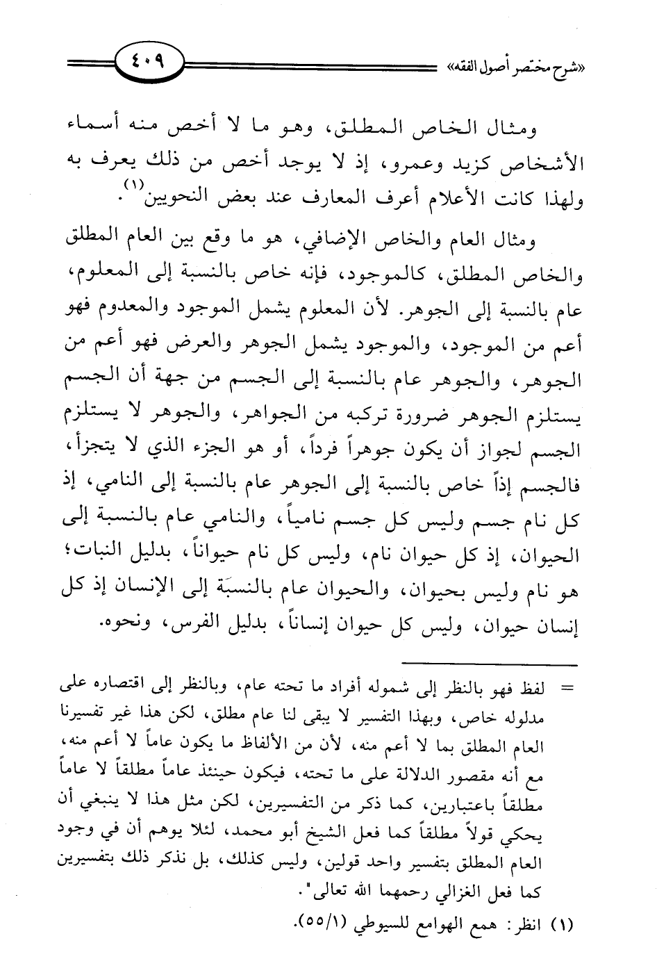 ومثال العام والخاص الإضافي، هو ما وقع بين العام المطلق والخاص المطلق، كالموجود، فإنه خاص بالنسبة إلى المعلوم، عام بالنسبة إلى الجوهر. لأن المعلوم يشمل الموجود والمعدوم فهو أعم من الموجود، والموجود يشمل الجوهر والعرض فهو أعم من الجوهر، والجوهر عام بالنسبة إلى الجسم من جهة أن الجسم يستلزم الجوهر ضرورة تركبه من الجواهر، والجوهر لا يستلزم الجسم لجواز أن يكون جوهرًا فردًا، أو هو الجزء الذي لا يتجزأ، فالجسم إذًا خاص بالنسبة إلى الجوهر عام بالنسبة إلى النامي، إذ كل نام جسم وليس كل جسم ناميًا، والنامي عام بالنسبة إلى الحيوان، إذ كل حيوان نام، وليس كل نام حيوانًا، بدليل النبات؛ هو نام وليس بحيوان، والحيوان عام بالنسبة إلى الإنسان إذ كل إنسان حيوان، وليس كل حيوان إنسانًا، بدليل الفرس، ونحوه.