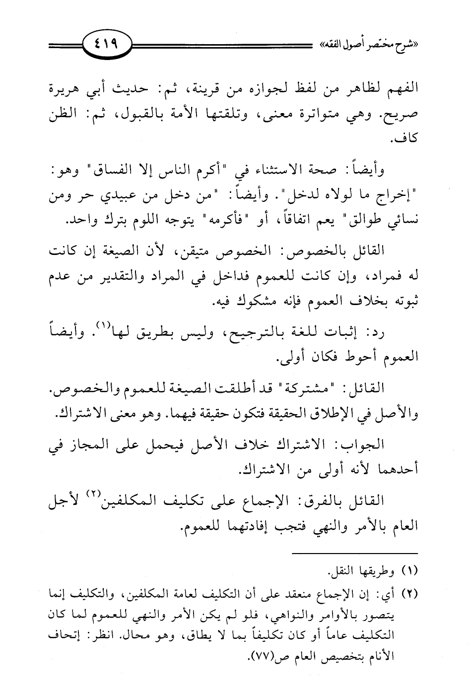 وأيضًا: صحة الاستثناء في "أكرم الناس إلا الفساق" وهو: "إخراج ما لولاه لدخل". وأيضًا: "من دخل من عبيدي حر ومن نسائي طوالق" يعم اتفاقًا، أو "فأكرمه" يتوجه اللوم بترك واحد.