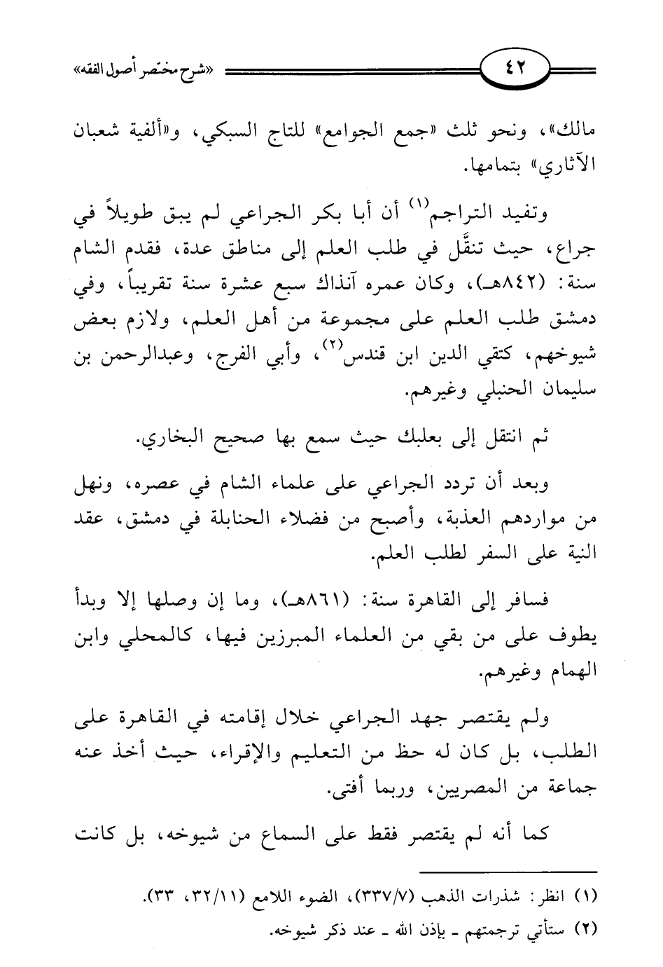 وتفيد التراجم (¬1) أن أبا بكر الجراعي لم يبق طويلًا في جراع، حيث تنقَّل في طلب العلم إلى مناطق عدة، فقدم الشام سنة: (842 هـ)، وكان عمره آنذاك سبع عشرة سنة تقريبًا، وفي دمشق طلب العلم على مجموعة من أهل العلم، ولازم بعض شيوخهم، كتقي الدين ابن قندس (¬2)، وأبي الفرج، وعبد الرحمن بن سليمان الحنبلي وغيرهم.