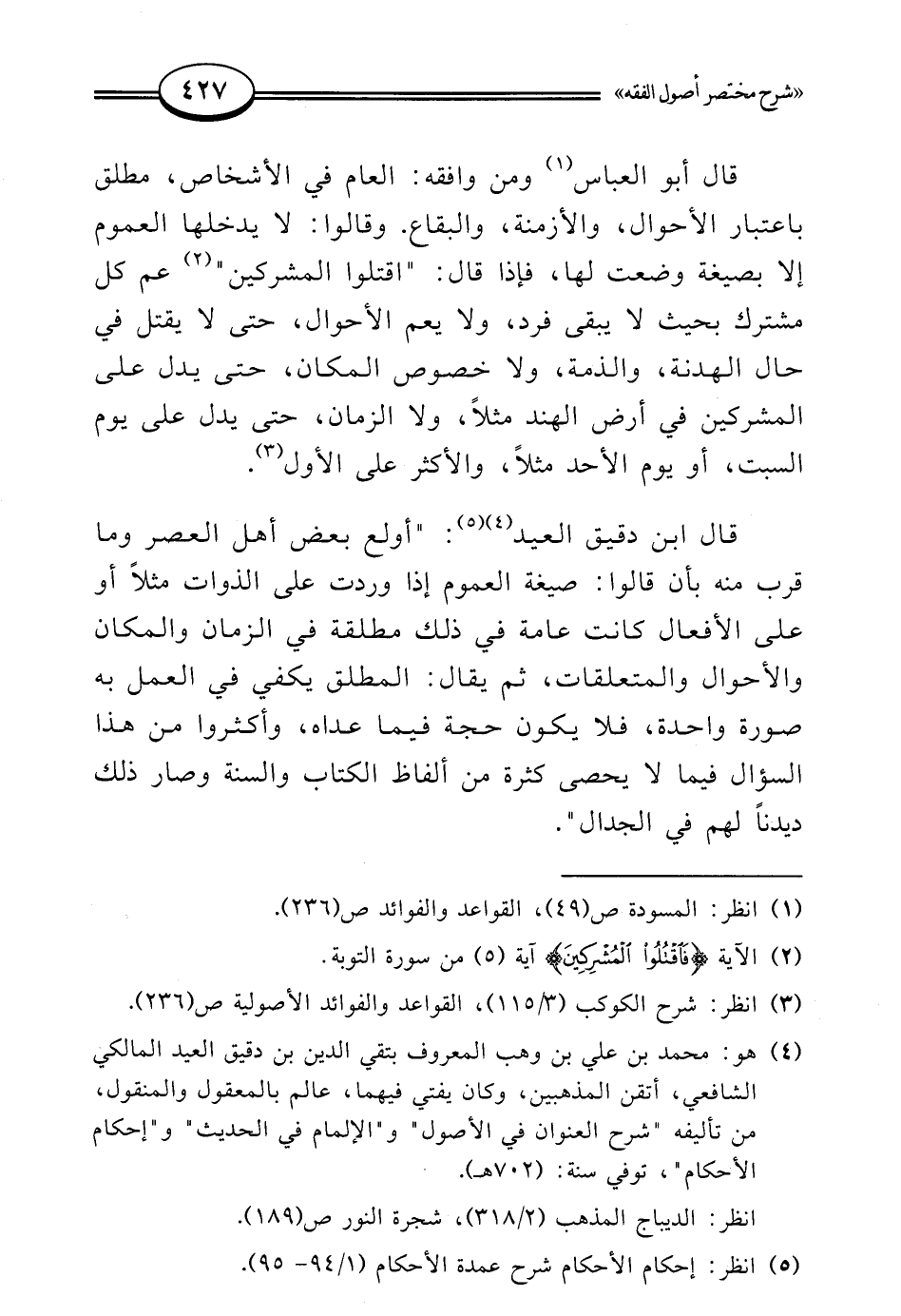 (¬4) هو: محمد بن علي بن وهب المعروف بتقي الدين بن دقيق العيد المالكي الشافعي، أتقن المذهبين، وكان يفتي فيهما، عالم بالمعقول والمنقول، من تأليفه "شرح العنوان في الأصول" و"الإلمام في الحديث" و"إحكام الأحكام"، توفي سنة: (702 هـ).