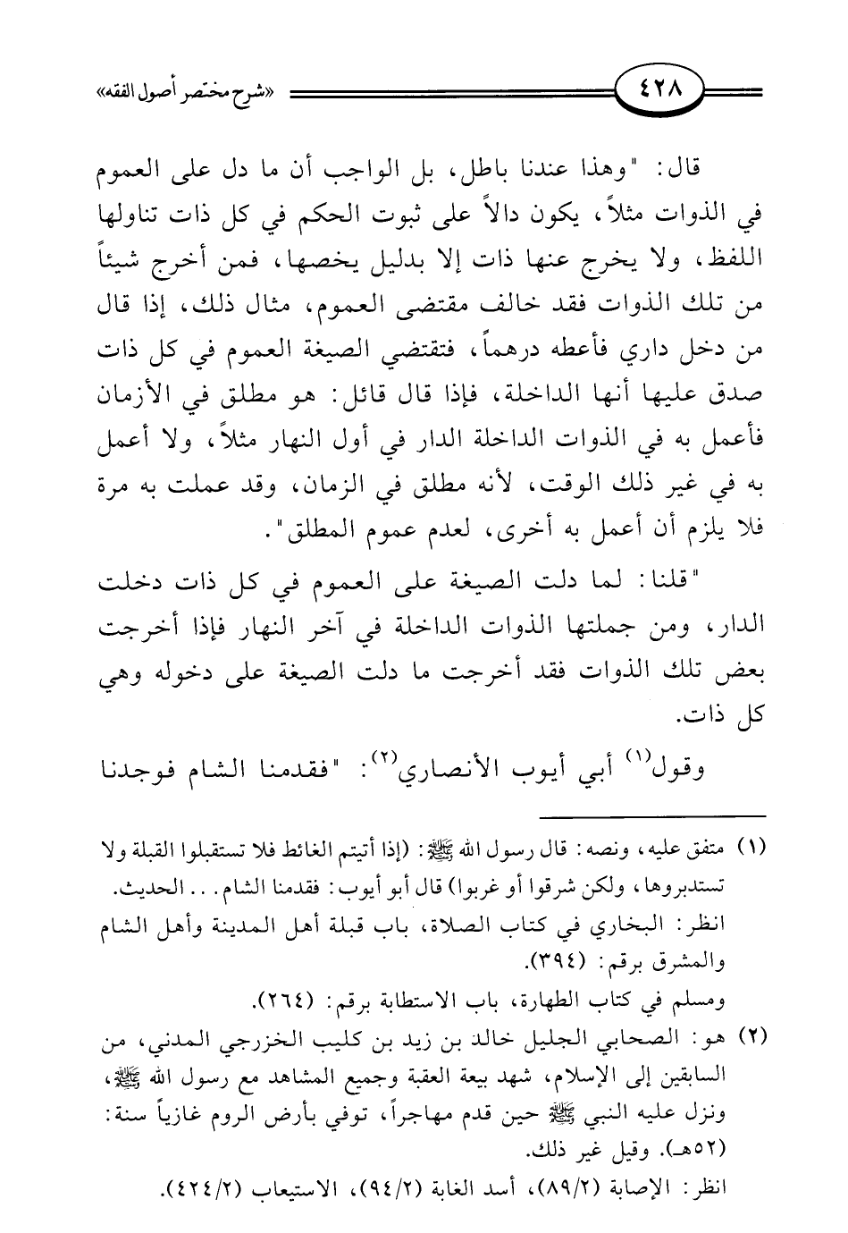 "قلنا: لما دلت الصيغة على العموم في كل ذات دخلت الدار، ومن جملتها الذوات الداخلة في آخر النهار فإذا أخرجت بعض تلك الذوات فقد أخرجت ما دلت الصيغة على دخوله وهي كل ذات.