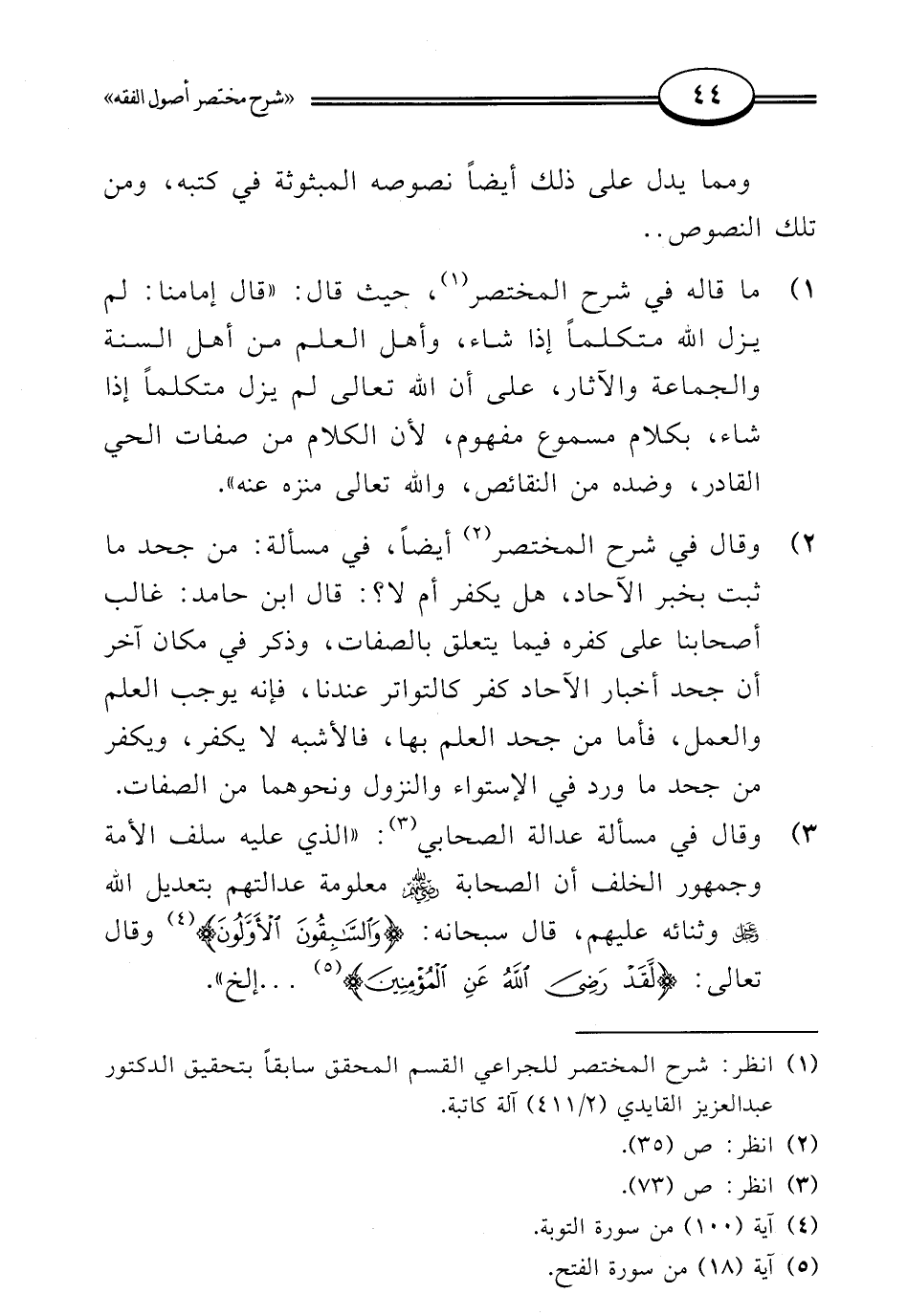 1) ما قاله في شرح المختصر (¬1)، حيث قال: "قال إمامنا: لم يزل الله متكلمًا إذا شاء، وأهل العلم من أهل السنة والجماعة والآثار، على أن الله تعالى لم يزل متكلمًا إذا شاء، بكلام مسموع مفهوم، لأن الكلام من صفات الحي القادر، وضده من النقائص، والله تعالى منزه عنه".