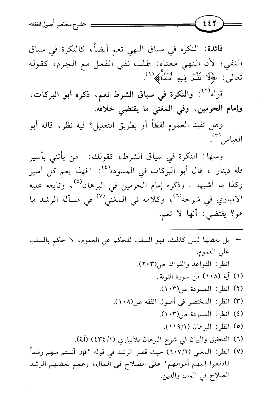 فائدة: النكرة في سياق النهي تعم أيضًا، كالنكرة في سياق النفي؛ لأن النهي معناه: طلب نفي الفعل مع الجزم، كقوله تعالى: {لَا تَقُمْ فِيهِ أَبَدًا} (¬1).