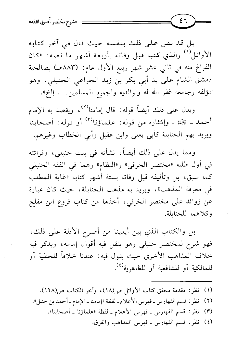 بل والكتاب الذي بين أيدينا من أصرح الأدلة على ذلك، فهو شرح لمختصر حنبلي وهو ينقل فيه أقوال إمامه، ويذكر فيه خلاف المذاهب الأخرى حيث يقول فيه: عندنا خلافًا للحنفية أو للمالكية أو للشافعية أو للظاهرية (¬4).