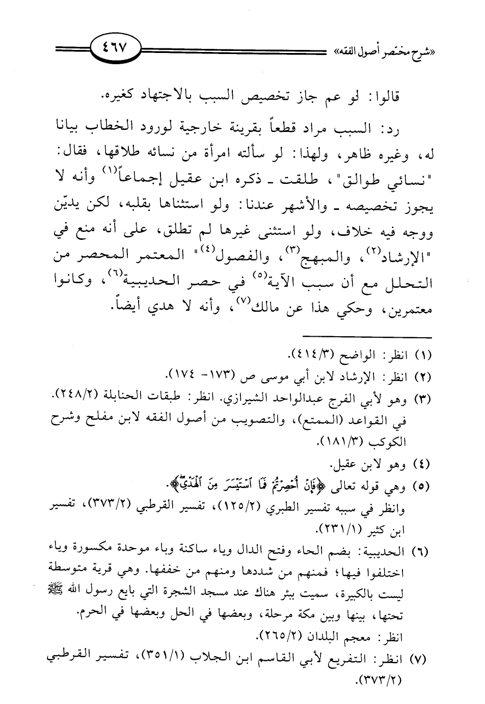 رد: السبب مراد قطعًا بقرينة خارجية لورود الخطاب بيانا له، وغيره ظاهر، ولهذا: لو سألته امرأة من نسائه طلاقها، فقال: "نسائي طوالق"، طلقت - ذكره ابن عقيل إجماعًا (¬1) وأنه لا يجوز تخصيصه - والأشهر عندنا: ولو استثناها بقلبه، لكن يديّن ووجه فيه خلاف، ولو استثنى غيرها لم تطلق، على أنه منع في "الإرشاد (¬2)، والمبهج (¬3)، والفصول (¬4) " المعتمر المحصر من التحلل مع أن سبب الآية (¬5) في حصر الحديبية (¬6)، وكانوا معتمرين، وحكي هذا عن مالك (¬7)، وأنه لا هدي أيضًا.