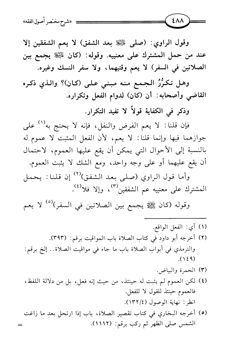 وقول الراوي: (صلى - صلى الله عليه وسلم - بعد الشفق) لا يعم الشفقين إلا عند من حمل المشترك على معنييه. وقوله: (كان - صلى الله عليه وسلم - يجمع بين الصلاتين في السفر) لا يعم وقتيهما، ولا سفر النسك وغيره.