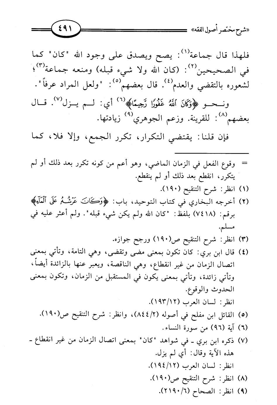 فلهذا قال جماعة (¬1): يصح ويصدق على وجود الله "كان" كما في الصحيحين (¬2): (كان الله ولا شيء قبله) ومنعه جماعة (¬3)؛ لشعوره بالتقضي والعدم (¬4). قال بعضهم (¬5): "ولعل المراد عرفًا".