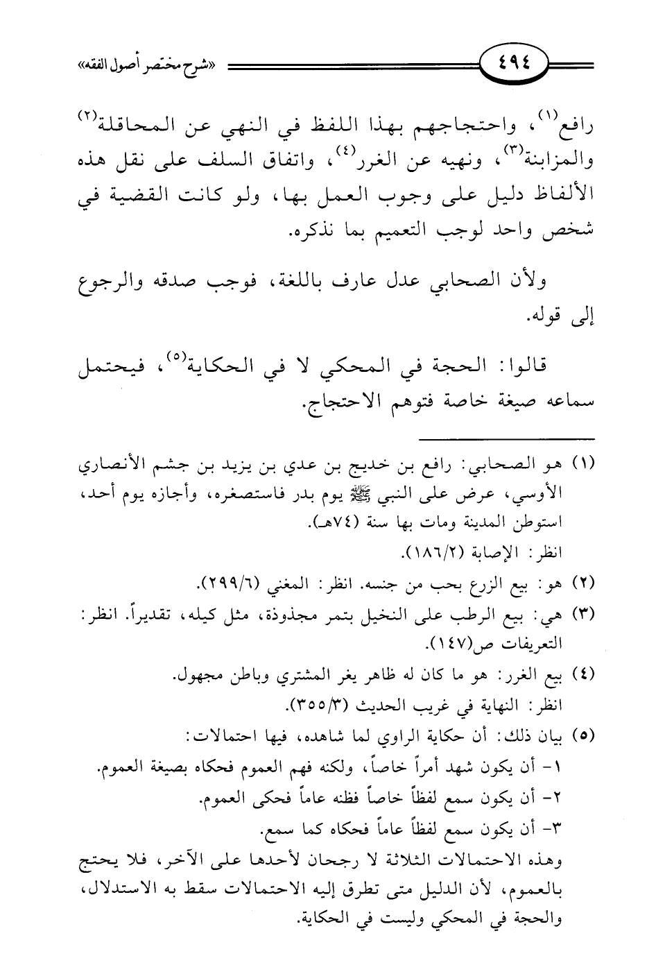 رافع (¬1)، واحتجاجهم بهذا اللفظ في النهي عن المحاقلة (¬2) والمزابنة (¬3)، ونهيه عن الغرر (¬4)، واتفاق السلف على نقل هذه الألفاظ دليل على وجوب العمل بها، ولو كانت القضية في شخص واحد لوجب التعميم بما نذكره.