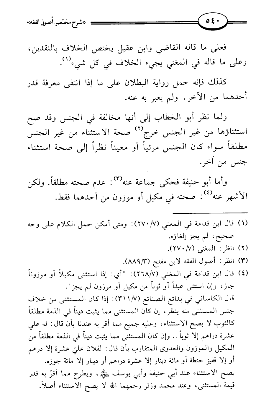 (¬4) قال ابن قدامة في المغني (7/ 268): "أي: إذا استثنى مكيلًا أو موزونًا جاز، وإن استثنى عبدًا أو ثوبًا من مكيل أو موزون لم يجز".