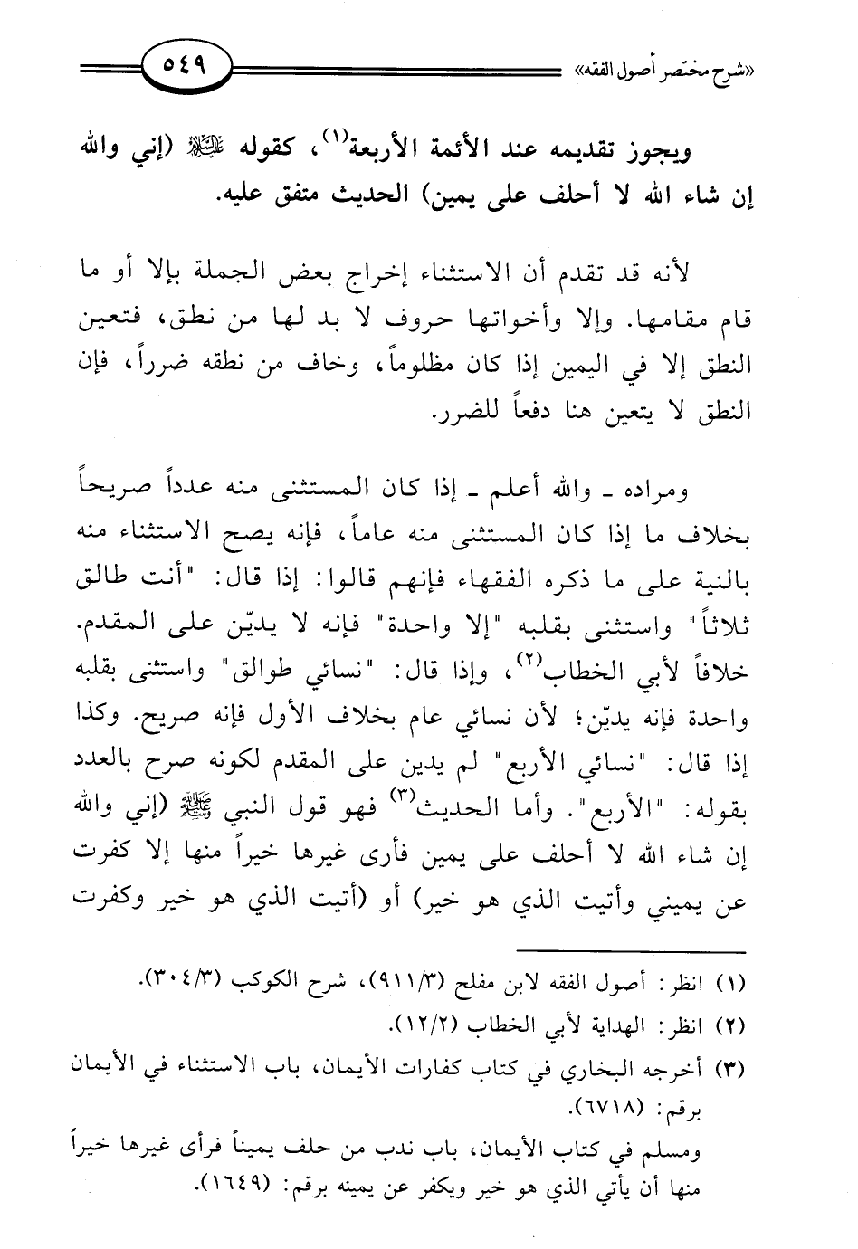 ومراده - والله أعلم - إذا كان المستثنى منه عددًا صريحًا بخلاف ما إذا كان المستثنى منه عامًا، فإنه يصح الاستثناء منه بالنية على ما ذكره الفقهاء فإنهم قالوا: إذا قال: "أنت طالق ثلاثًا" واستثنى بقلبه "إلا واحدة" فإنه لا يديّن على المقدم. خلافًا لأبي الخطاب (¬2)، وإذا قال: "نسائي طوالق" واستثنى بقلبه واحدة فإنه يديّن؛ لأن نسائي عام بخلاف الأول فإنه صريح. وكذا إذا قال: "نسائي الأربع" لم يدين على المقدم لكونه صرح بالعدد بقوله: "الأربع". وأما الحديث (¬3) فهو قول النبي - صلى الله عليه وسلم - (إني والله إن شاء الله لا أحلف على يمين فأرى غيرها خيرًا منها إلا كفرت عن يميني وأتيت الذي هو خير) أو (أتيت الذي هو خير وكفرت
