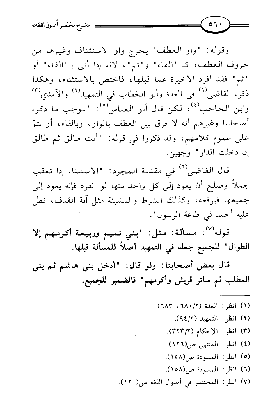وقوله: "واو العطف" يخرج واو الاستئناف وغيرها من حروف العطف، كـ "الفاء" و"ثم"، لأنه إذا أتى بـ "الفاء" أو "ثم" فقد أفرد الأخيرة عما قبلها، فاختص بالاستثناء، وهكذا ذكره القاضي (¬1) في العدة وأبو الخطاب في التمهيد (¬2) والآمدي (¬3) وابن الحاجب (¬4)، لكن قال أبو العباس (¬5): "موجب ما ذكره أصحابنا وغيرهم أنه لا فرق بين العطف بالواو، وبالفاء، أو بثمّ على عموم كلامهم، وقد ذكروا في قوله: "أنت طالق ثم طالق إن دخلت الدار" وجهين.
