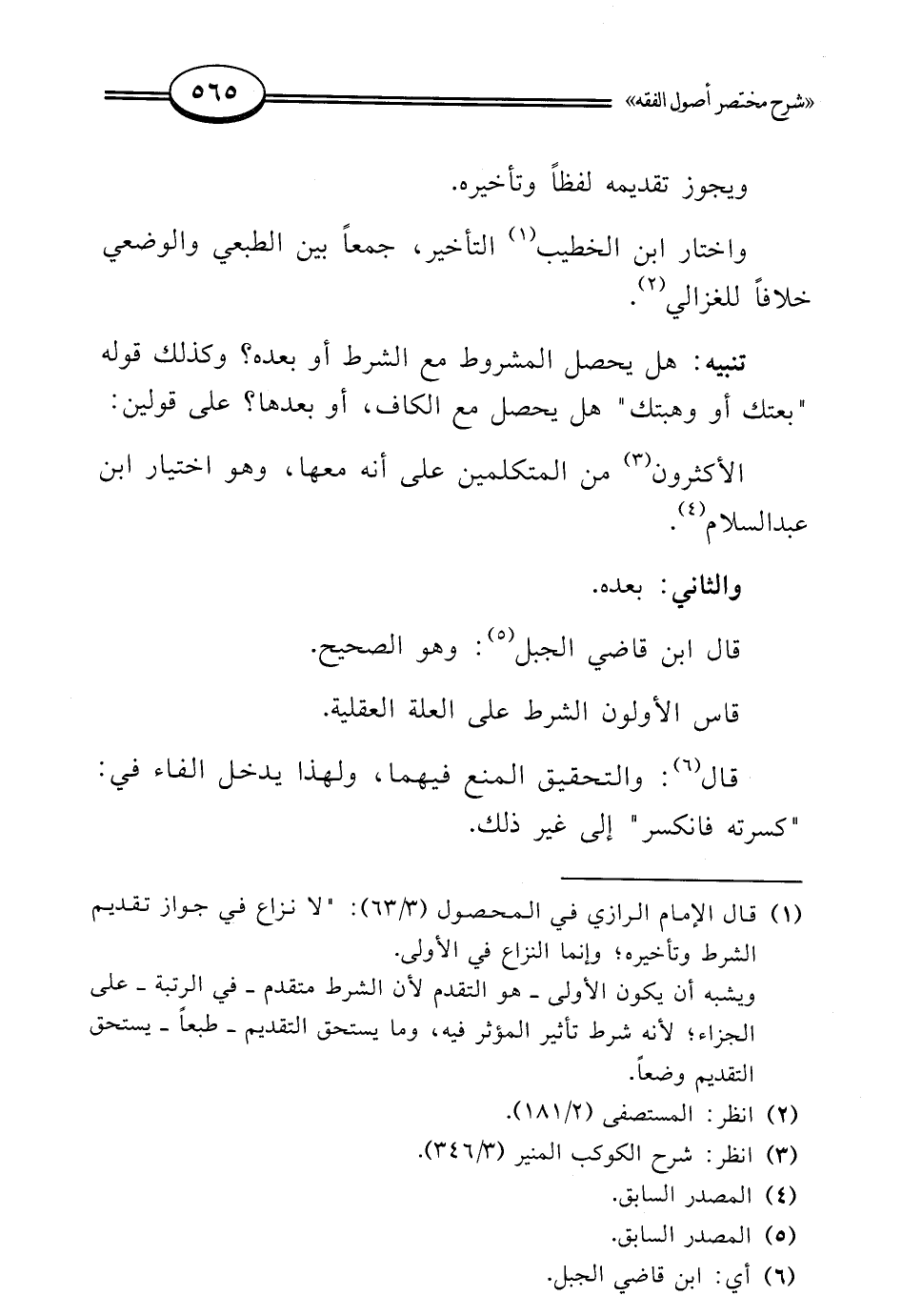 (¬1) قال الإمام الرازي في المحصول (3/ 63): "لا نزاع في جواز تقديم الشرط وتأخيره؛ وإنما النزاع في الأولى.