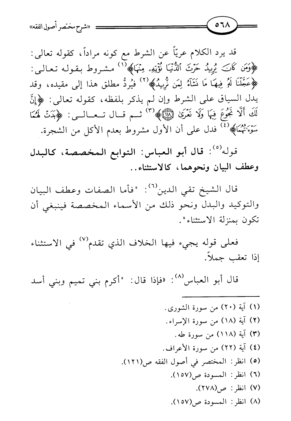 قوله (¬5): قال أبو العباس: التوابع المخصصة، كالبدل وعطف البيان ونحوهما، كالاستثناء ..