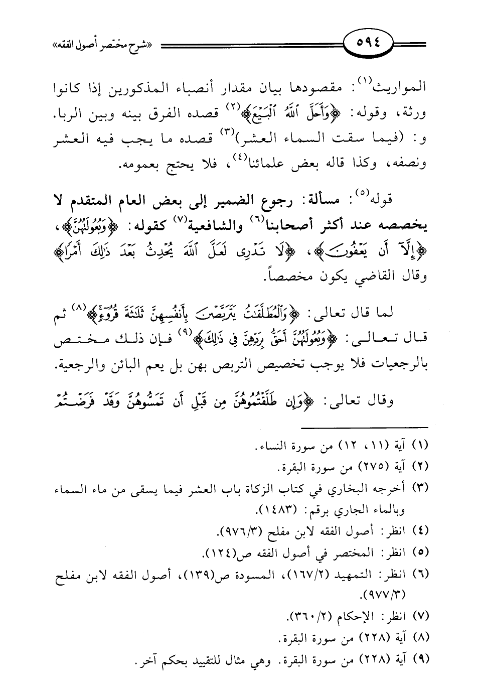 المواريث (¬1): مقصودها بيان مقدار أنصباء المذكورين إذا كانوا ورثة، وقوله: {وَأَحَلَّ اللَّهُ الْبَيْعَ} (¬2) قصده الفرق بينه وبين الربا. و: (فيما سقت السماء العشر) (¬3) قصده ما يجب فيه العشر ونصفه، وكذا قاله بعض علمائنا (¬4)، فلا يحتج بعمومه.