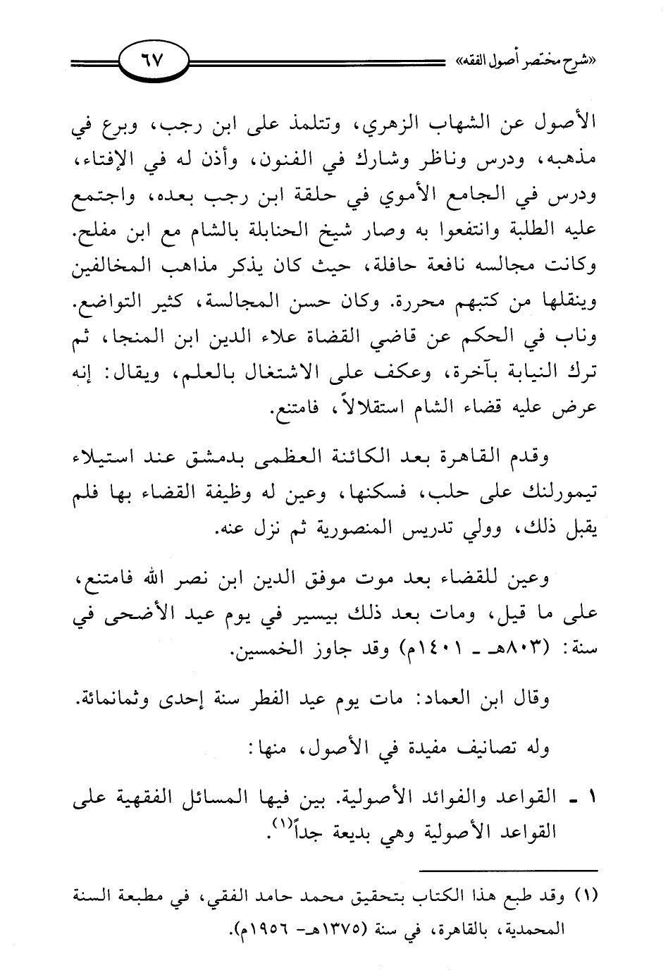 الأصول عن الشهاب الزُّهريّ، وتتلمذ على ابن رجب، وبرع في مذهبه، ودرس وناظر وشارك في الفنون، وأذن له في الإفتاء، ودرس في الجامع الأموي في حلقة ابن رجب بعده، واجتمع عليه الطلبة وانتفعوا به وصار شيخ الحنابلة بالشام مع ابن مفلح. وكانت مجالسه نافعة حافلة، حيث كان يذكر مذاهب المخالفين وينقلها من كتبهم محررة. وكان حسن المجالسة، كثير التواضع. وناب في الحكم عن قاضي القضاة علاء الدين ابن المنجا، ثم ترك النيابة بآخرة، وعكف على الاشتغال بالعلم، ويقال: إنَّه عرض عليه قضاء الشَّام استقلالًا، فامتنع.