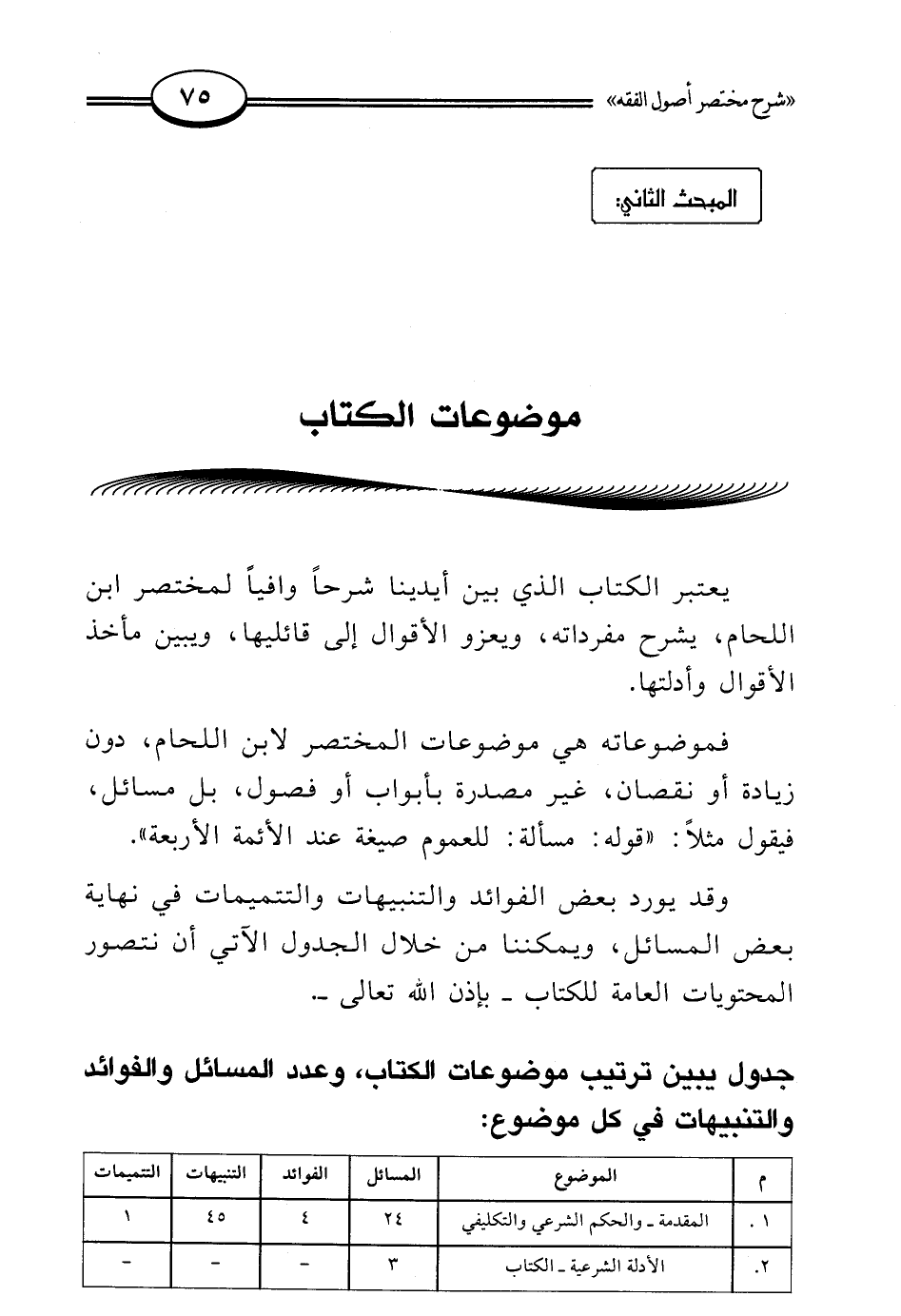 جدول يبين ترتيب موضوعات الكتاب، وعدد المسائل والفوائد والتنبيهات في كل موضوع: