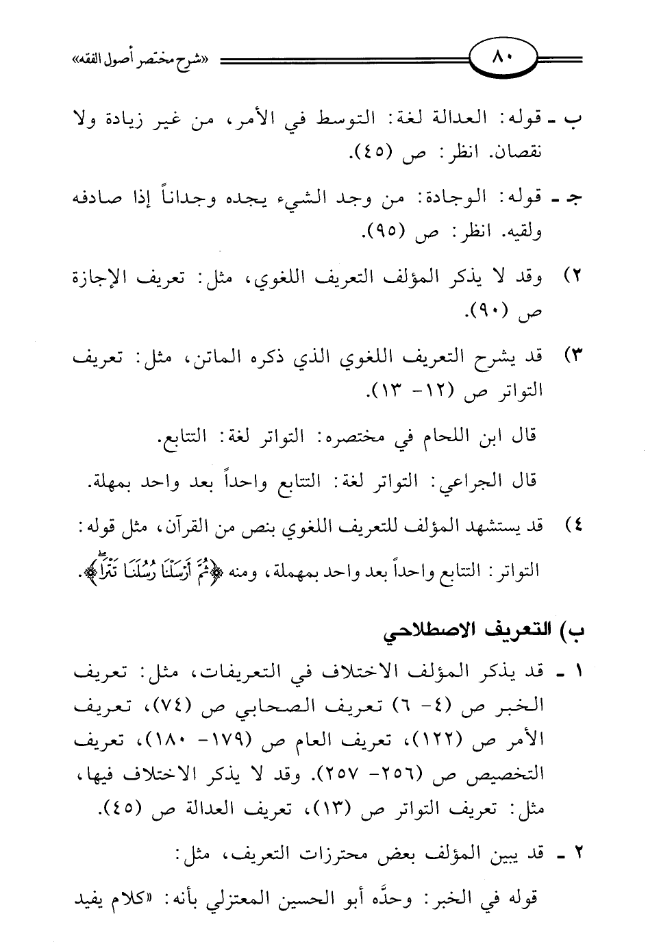 4) قد يستشهد المؤلف للتعريف اللغوي بنص من القرآن، مثل قوله: التواتر: التتابع واحدًا بعد واحد بمهملة، ومنه {ثُمَّ أَرْسَلْنَا رُسُلَنَا تَتْرَى}.