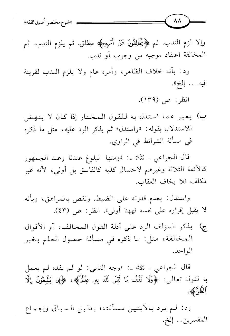 ج) يذكر المؤلف الرد على أدلة القول المخالف، أو الأقوال المخالفة، مثل: ما ذكره في مسألة حصول العلم بخبر الواحد.