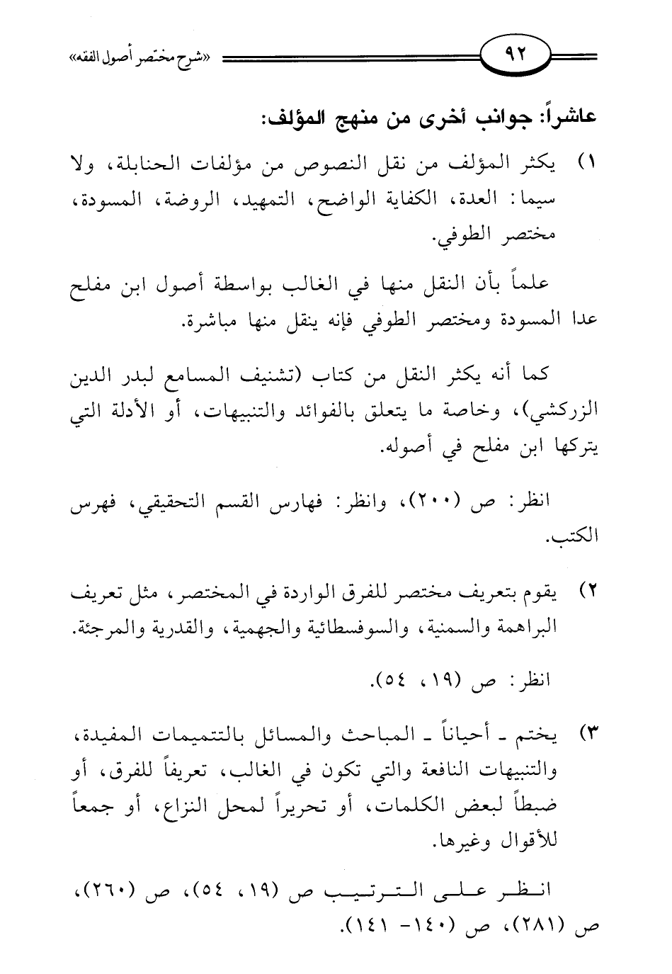 1) يكثر المؤلف من نقل النصوص من مؤلفات الحنابلة، ولا سيما: العدة، الكفاية الواضح، التمهيد، الروضة، المسودة، مختصر الطوفي.