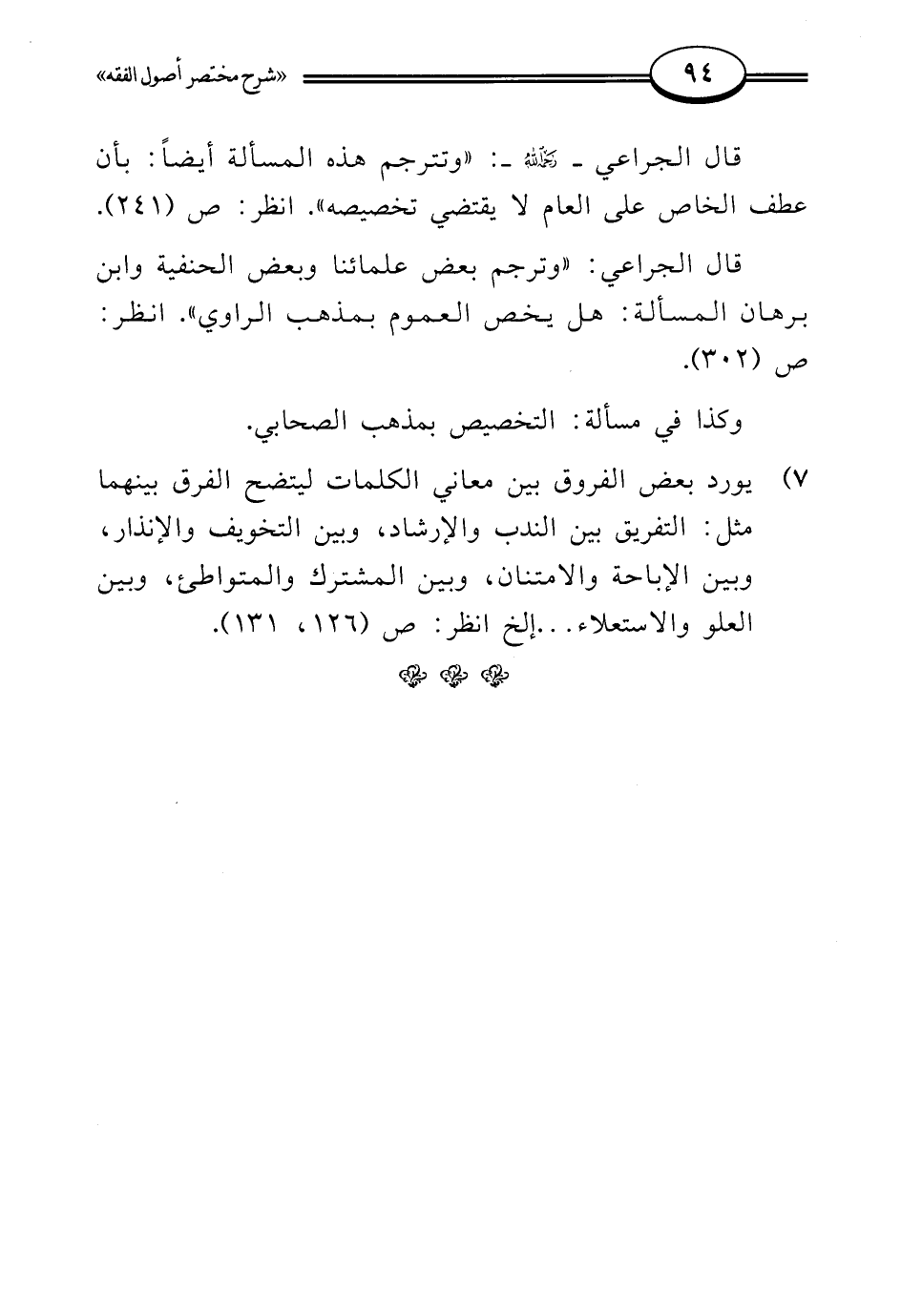 قال الجراعي -رَحِمَهُ اللهُ-: "وتترجم هذه المسألة أيضًا: بأن عطف الخاص على العام لا يقتضي تخصيصه". انظر: ص (241).
