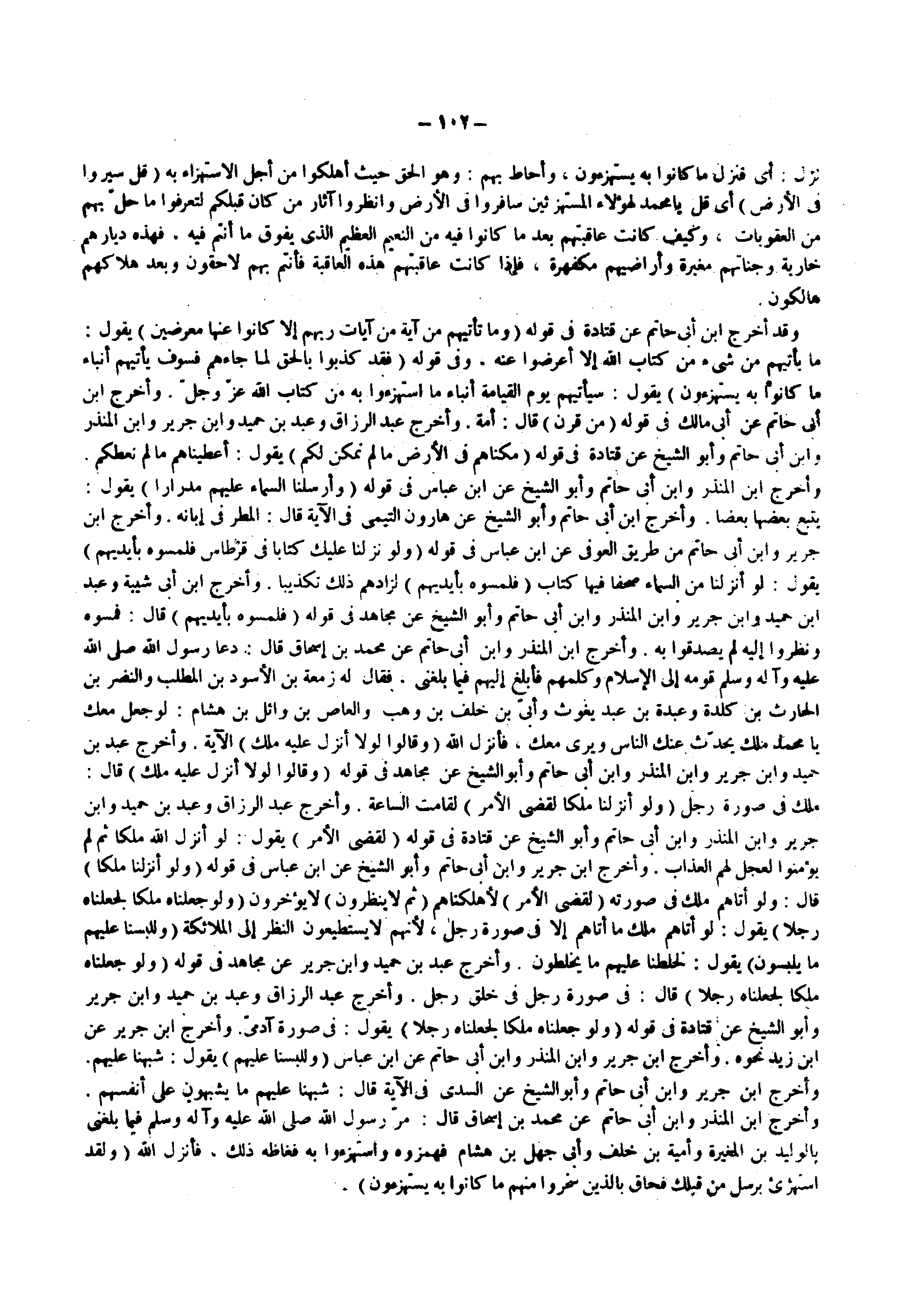 وقد أخرج ابن أبي حاتم عن قتادة فى قوله ) وما تأتيهم من آية من آيات ربهم إلا كانوا عنها معرضين ( يقول ما يأتيهم من شيء من كتاب الله إلا أعرضوا عنه وفى قوله ) فقد كذبوا بالحق لما جاءهم فسوف يأتيهم أنباء ما كانوا به يستهزؤون ( يقول سيأتيهم يوم القيامة أنباء ما استهزءوا به من كتاب الله عز وجل وأخرج ابن أبي حاتم عن أبي مالك في قوله ) من قرن ( قال أمة وأخرج عبد الرزاق وعبد بن حميد وابن جرير وابن المنذر وابن أبي حاتم وأبو الشيخ عن قتادة في قوله ) مكناهم في الأرض ما لم نمكن لكم ( يقول أعطيناهم ما لم نعطكم وأخرج ابن المنذر وابن أبي حاتم وأبو الشيخ عن ابن عباس في قوله ) وأرسلنا السماء عليهم مدرارا ( يقول يتبع بعضها بعضا وأخرج ابن أبي حاتم وأبو الشيخ عن هارون التيمي في الآية قال المطر في إبانه وأخرج ابن جرير وابن أبي حاتم من طريق العوفي عن ابن عباس في قوله ) ولو نزلنا عليك كتابا في قرطاس فلمسوه بأيديهم ( يقول لو أنزلنا من السماء صحفا فيها كتاب ) فلمسوه بأيديهم ( لزادهم ذلك تكذيبا وأخرج ابن أبي شيبة وعبد ابن حميد وابن جرير وابن المنذر وابن أبي حاتم وأبو الشيخ عن مجاهد في قوله ) فلمسوه بأيديهم ( قال فمسوه ونظروا إليه لم يصدقوا به وأخرج ابن المنذر وابن أبي حاتم عن محمد بن إسحاق قال دعا رسول الله ( صلى الله عليه وسلم ) قومه إلى الإسلام وكلمهم فأبلغ إليهم فيما بلغني فقال له زمعة بن الأسود بن المطلب والنضر بن الحارث بن كلدة وعبدة بن عبد يغوث وأبي بن خلف بن وهب والعاص بن وائل بن هشام لو جعل معك يا محمد ملك يحدث عنك الناس ويرى معك فأنزل الله ) وقالوا لولا أنزل عليه ملك ( الآية وأخرج عبد بن حميد وابن جرير وابن المنذر وابن أبي حاتم وأبو الشيخ عن مجاهد في قوله ) وقالوا لولا أنزل عليه ملك ( قال ملك في صورة رجل ) ولو أنزلنا ملكا لقضي الأمر ( لقامت الساعة وأخرج عبد الرزاق وعبد بن حميد وابن جرير وابن المنذر وابن أبي حاتم وأبو الشيخ عن قتادة في قوله ) لقضي الأمر ( يقول لو أنزل الله ملكا ثم لم يؤمنوا لعجل لهم العذاب وأخرج ابن جرير وابن أبي حاتم وأبو الشيخ عن ابن عباس في قوله ) ولو أنزلنا ملكا ( قال ولو أتاهم ملك في صورته ) لقضي الأمر ( لأهلكناهم ) ثم لا ينظرون ( لا يؤخرون ) ولو جعلناه ملكا لجعلناه رجلا ( يقول لو أتاهم ملك ما أتاهم إلا في صورة رجل لأنهم لا يستطيعون النظر إلى الملائكة ) وللبسنا عليهم ما يلبسون ( يقول لخلطنا عليهم ما يخلطون وأخرج عبد بن حميد وابن جرير عن مجاهد في قوله ) ولو جعلناه ملكا لجعلناه رجلا ( قال في صورة رجل في خلق رجل وأخرج عبد الرزاق وعبد بن حميد وابن جرير وأبو الشيخ عن قتادة في قوله ) ولو جعلناه ملكا لجعلناه رجلا ( يقول في صورة آدمي وأخرج ابن جرير عن ابن زيد نحوه وأخرج ابن جرير وابن المنذر وابن أبي حاتم عن ابن عباس ) وللبسنا عليهم ( يقول شبهنا عليهم وأخرج ابن جرير وابن أبي حاتم وأبو الشيخ عن السدي في الآية قال شبهنا عليهم ما يشبهون على أنفسهم وأخرج ابن المنذر وابن أبي حاتم عن محمد بن إسحاق قال مر رسول الله ( صلى الله عليه وسلم ) فيما بلغني بالوليد بن المغيرة وأمية بن خلف وأبي جهل بن هشام فهمزوه واستهزءوا به فغاظه ذلك فأنزل الله ) ولقد استهزئ برسل من قبلك فحاق بالذين سخروا منهم ما كانوا به يستهزؤون (