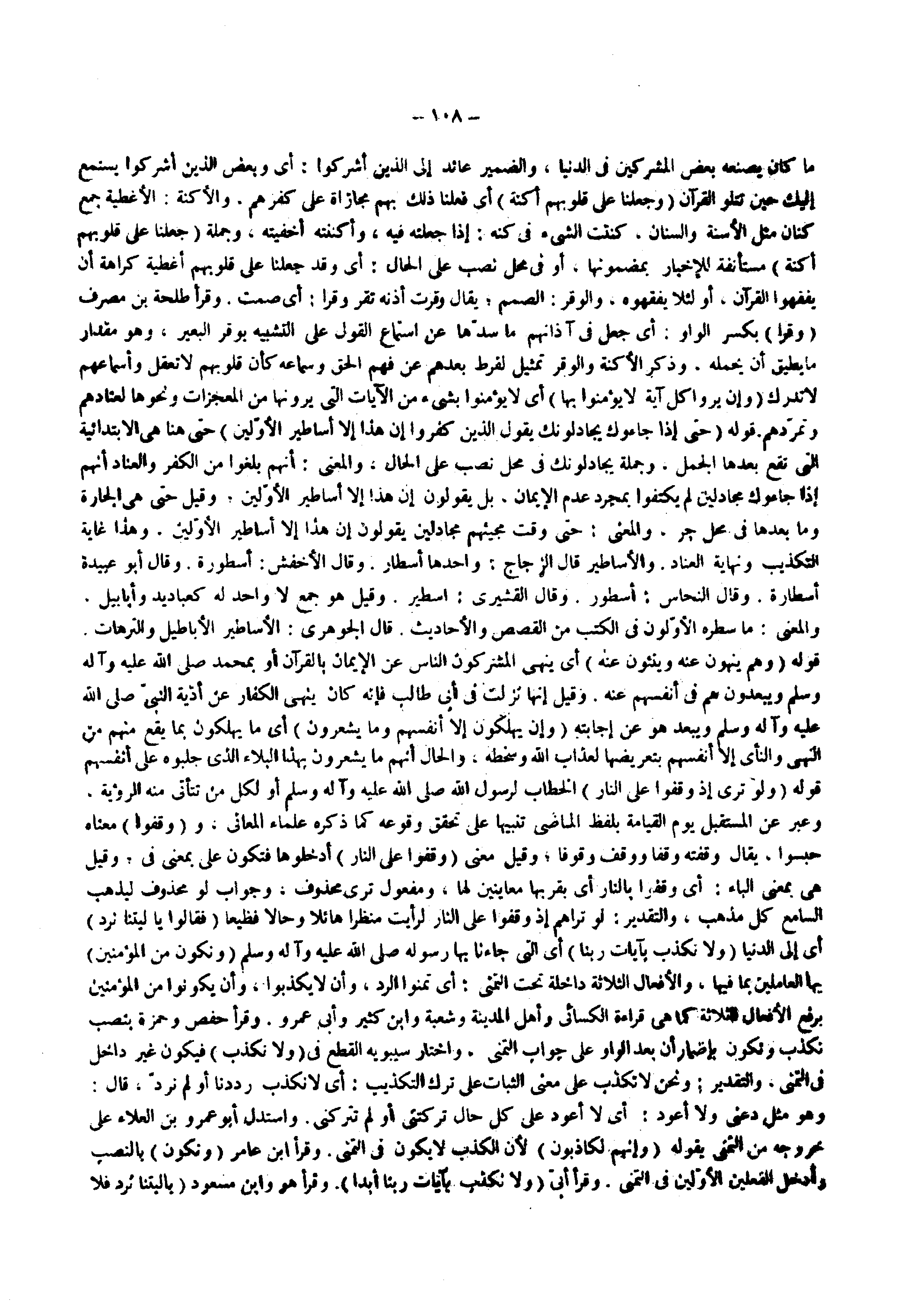 ما كان يصنعه بعض المشركين في الدنيا والضمير عائد إلى الذين أشركوا أي وبعض الذين أشركوا يستمع إليك حين تتلو القرآن ) وجعلنا على قلوبهم أكنة ( أي فعلنا ذلك بهم مجازاة على كفرهم والأكنة الأغطية جمع كنان مثل الأسنة والسنان كننت الشيء في كنه إذا جعلته فيه وأكننه أخفيته وجملة ) جعلنا على قلوبهم أكنة ( مستأنفة للإخبار بمضمونها أو في محل نصب على الحال أي وقد جعلنا على قلوبهم أغطية كراهة أن يفقهوا القرآن أو لئلا يفقهوه والوقر الصمم يقال وقرت أذنه تقر وقرا أي صمت وقرأ طلحة بن مصرف ) وقرا ( بكسر الواو أي جعل في آذانهم ما سدها عن استماع القول على التشبيه بوقر البعير وهو مقدار ما يطيق أن يحمله وذكر الأكنة والوقر تمثيل لفرط بعدهم عن فهم الحق وسماعه كأن قلوبهم لا تعقل وأسماعهم لا تدرك ) وإن يروا كل آية لا يؤمنوا بها ( أي لا يؤمنوا بشيء من الآيات التى يرونها من المعجزات ونحوها لعنادهم وتمردهم قوله ) حتى إذا جاؤوك يجادلونك يقول الذين كفروا إن هذا إلا أساطير الأولين ( حتى هنا هى الابتدائية التى تقع بعدها الجمل وجملة يجادلونك في محل نصب على الحال والمعنى أنهم بلغوا من الكفر والعناد أنهم إذا جاءوك مجادلين لم يكتفوا بمجرد عدم الإيمان بل يقولون إن هذا إلا أساطير الأولين وقيل حتى هى الجارة وما بعدها في محل جر والمعنى حتى وقت مجيئهم مجادلين يقولون إن هذا إلا أساطير الأولين وهذا غاية التكذيب ونهاية العناد والأساطير قال الزجاج واحدها أسطار وقال الأخفش أسطورة وقال أبو عبيدة أسطاره وقال النحاس أسطور وقال القشيري اسطير وقيل هو جمع لا واحد له كعباديد وأبابيل والمعنى ما سطره الأولون في الكتب من القصص والأحاديث قال الجوهري الأساطير الأباطيل والترهات