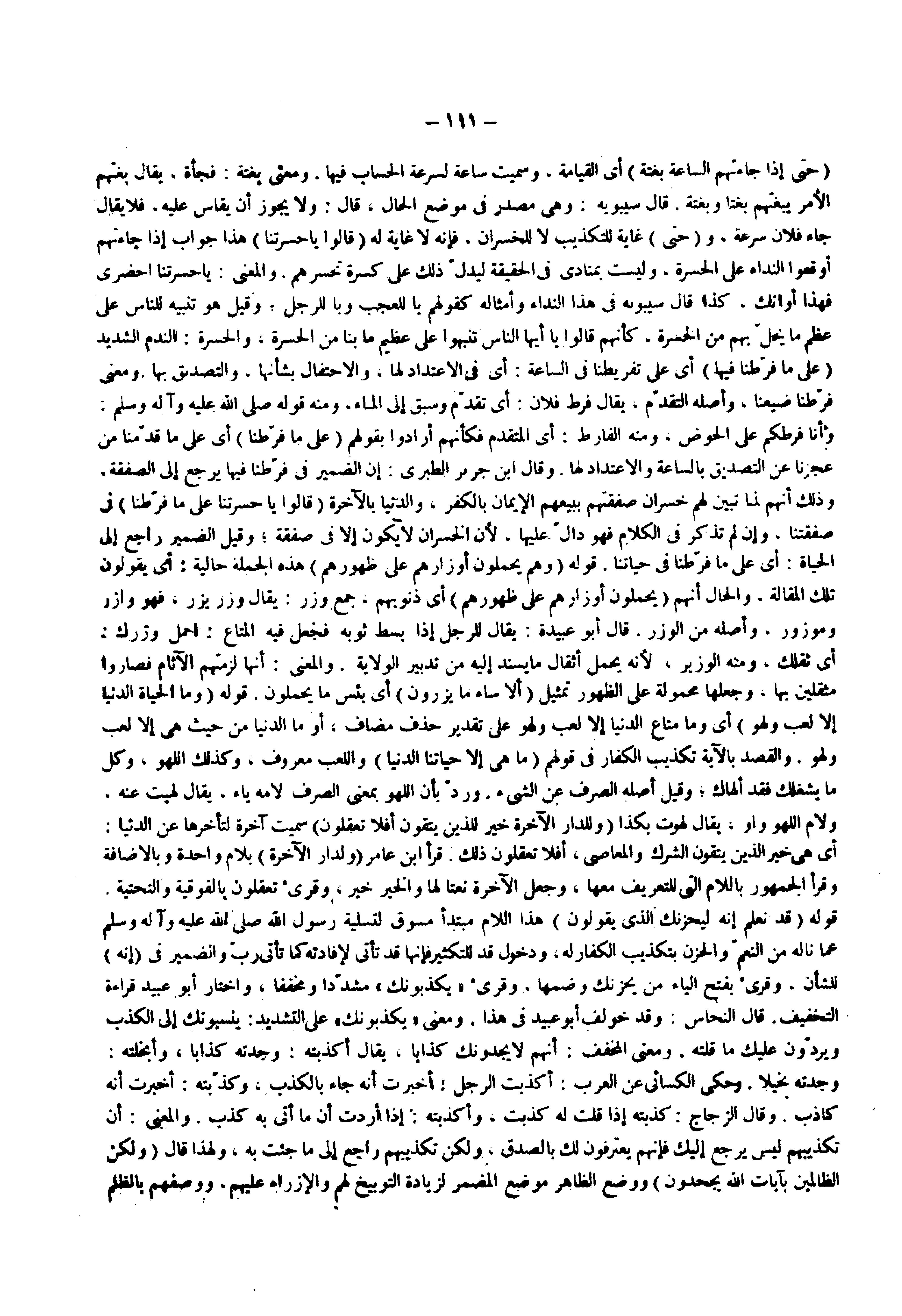 أي القيامة وسميت ساعة لسرعة الحساب فيها ومعنى بغتة فجأة يقال بغتهم الأمر يبغتهم بغتا وبغتة قال سيبويه وهى مصدر في موضع الحال قال ولا يجوز أن يقاس عليه فلا يقال جاء فلان سرعة و ) حتى ( غاية للتكذيب لا للخسران فإنه لا غاية له ) قالوا يا حسرتنا ( هذا جواب إذا جاءتهم أوقعوا النداء على الحسرة وليست بمنادى في الحقيقة ليدل ذلك على كسرة تحسرهم والمعنى يا حسرتنا احضري فهذا أوانك كذا قال سيبويه في هذا النداء وأمثاله كقولهم يا للعجب ويا للرجل وقيل هو تنبيه للناس على عظم ما يحل بهم من الحسرة كأنهم قالوا يا أيها الناس تنبهوا على عظيم ما بنا من الحسرة والحسرة الندم الشديد ) على ما فرطنا فيها ( أي على تفريطنا في الساعة أي في الاعتداد لها والاحتفال بشأنها والتصديق بها ومعنى فرطنا ضيعنا وأصله التقدم يقال فرط فلان أي تقدم وسبق إلى الماء ومنه قوله ( صلى الله عليه وسلم ) وأنا فرطكم على الحوض ومنه الفارط أي المتقدم فكأنهم أرادوا بقولهم ) على ما فرطنا ( أي على ما قدمنا من عجزنا عن التصديق بالساعة والاعتداد لها وقال ابن جرير والطبري إن الضمير في فرطنا فيها يرجع إلى الصفقة وذلك أنهم لما تبين لهم خسران صفقتهم ببيعهم الإيمان بالكفر والدنيا بالآخرة ) قالوا يا حسرتنا على ما فرطنا ( في صفقتنا وإن لم تذكر في الكلام فهو دال عليها لأن الخسران لا يكون إلى في صفقة وقيل الضمير راجع إلى الحياة أي على ما فرطنا في حياتنا قوله ) وهم يحملون أوزارهم على ظهورهم ( هذه الجملة حالية أي يقولون تلك المقالة والحال أنهم ) يحملون أوزارهم على ظهورهم ( أي ذنوبهم جمع وزر يقال وزر يزر فهو وازر وموزور وأصله من الوزر قال أبو عبيدة يقال للرجل إذا بسط ثوبه فجعل فيه المتاع احمل وزرك أي ثقلك ومنه الوزير لأنه يحمل أثقال ما يسند إليه من تدبير الولاية والمعنى أنها لزمتهم الآثام فصاروا مثقلين بها وجعلها محمولة على الظهور تمثيل ) ألا ساء ما يزرون ( أي بئس ما يحملون