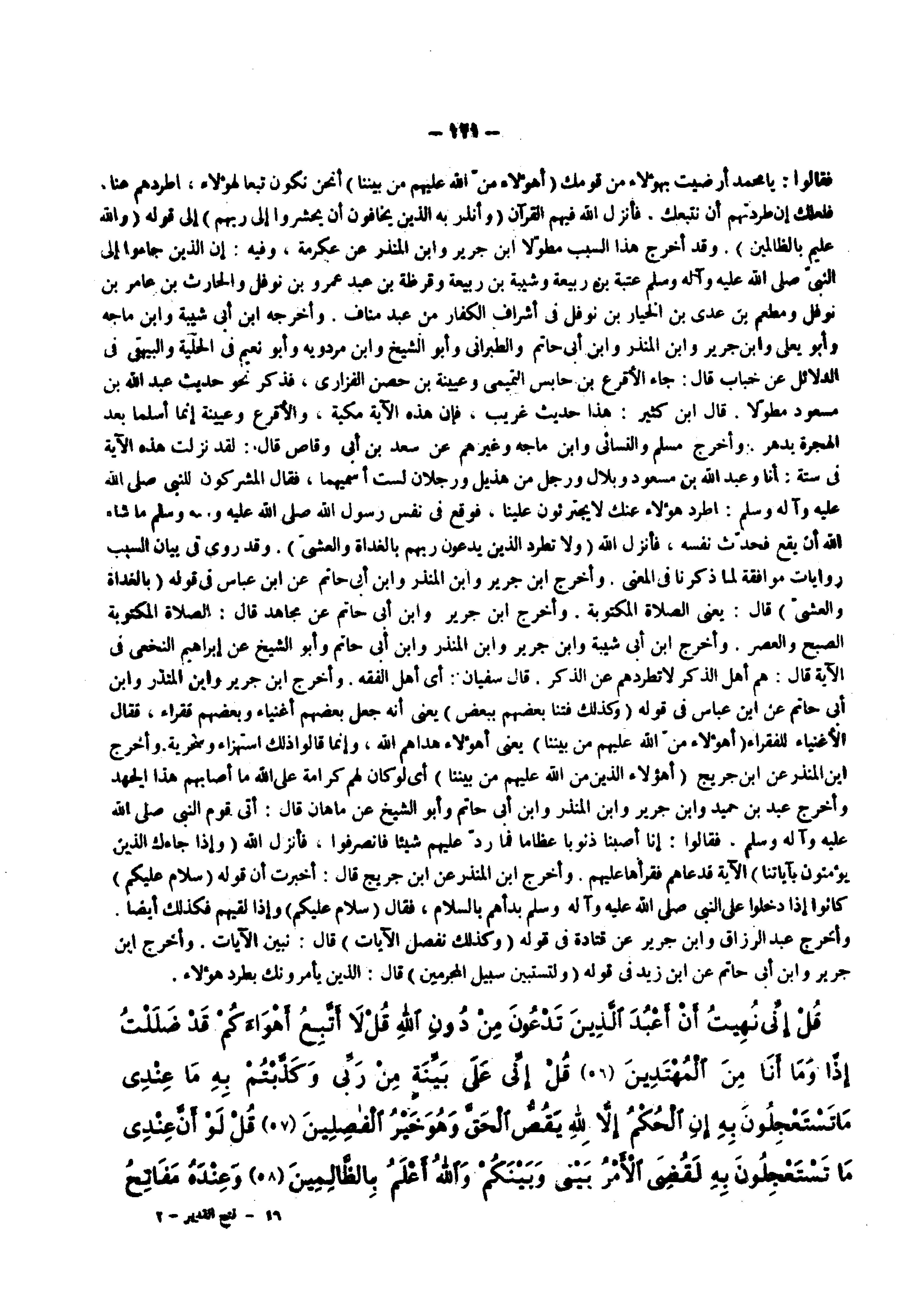 فقالوا يا محمد أرضيت بهؤلاء من قومك ) أهؤلاء من الله عليهم من بيننا ( أنحن نكون تبعا لهؤلاء اطردهم عنا فلعلك إن طردتهم أن نتبعك فأنزل الله فيهم القرآن ) وأنذر به الذين يخافون أن يحشروا إلى ربهم ( إلى قوله ) والله عليم بالظالمين ( وقد أخرج هذا السبب مطولا ابن جرير وابن المنذر عن عكرمة وفيه إن الذين جاءوا إلى النبي ( صلى الله عليه وسلم ) عتبة بن ربيعة وشيبة بن ربيعة وقرظة بن عبد عمرو بن نوفل والحارث بن عامر بن نوفل ومطعم بن عدي بن الخيار بن نوفل في أشراف الكفار من عبد مناف وأخرج ابن أبي شيبة وابن ماجه وأبو يعلى وابن جرير وابن المنذر وابن أبي حاتم والطبراني وأبو الشيخ وابن مردويه وأبو نعيم في الحلية والبيهقي في الدلائل عن خباب قال جاء الأقرع بن حابس التميمي وعيينة بن حصن الفزاري فذكر نحو حديث عبد الله بن مسعود مطولا قال ابن كثير هذا حديث غريب فإن هذه الآية مكية والأقرع وعيينة إنما أسلما بعد الهجرة بدهر وأخرج مسلم والنسائي وابن ماجه وغيرهم عن سعد بن أبي وقاص قال لقد نزلت هذه الآية في ستة أنا وعبد الله بن مسعود وبلال ورجل من هذيل ورجلان لست أسميهما فقال المشركين للنبي ( صلى الله عليه وسلم ) اطرد هؤلاء عنك لا يجترئون علينا فوقع في نفس رسول الله ( صلى الله عليه وسلم ) ما شاء الله أن يقع فحدث نفسه فأنزل الله ) ولا تطرد الذين يدعون ربهم بالغداة والعشي ( وقد روى في بيان السبب روايات موافقة لما ذكرنا في المعنى وأخرج ابن جرير وابن المنذر وابن أبي حاتم عن ابن عباس في قوله ) بالغداة والعشي ( قال يعنى الصلاة المكتوبة وأخرج ابن جرير وابن أبي حاتم عن مجاهد قال الصلاة المكتوبة الصبح والعصر وأخرج ابن أبي شيبة وابن جرير وابن المنذر وابن أبي حاتم وأبو الشيخ عن إبراهيم النخعي في الآية قال هم أهل الذكر لا تطردهم عن الذكر قال سفيان أي أهل الفقه وأخرج ابن جرير وابن المنذر وابن أبي حاتم عن ابن عباس في قوله ) وكذلك فتنا بعضهم ببعض ( يعنى أنه جعل بعضهم أغنياء وبعضهم فقراء فقال الأغنياء للفقراء ) أهؤلاء من الله عليهم من بيننا ( يعني أهؤلاء هداهم الله وإنما قالوا ذلك استهزاء وسخرية وأخرج ابن المنذر عن ابن جريح ) أهؤلاء من الله عليهم من بيننا ( أي لو كان لهم كرامة على الله ما أصابهم هذا الجهد وأخرج عبد بن حميد وابن جرير وابن المنذر وابن أبي حاتم وأبو الشيخ عن ماهان قال أتى قوم النبي ( صلى الله عليه وسلم ) فقالوا إنا أصبنا ذنوبا عظاما فما رد عليهم شيئا فانصرفوا فأنزل الله ) وإذا جاءك الذين يؤمنون بآياتنا ( الآية فدعاهم فقرأها عليهم وأخرج ابن المنذر عن ابن جريج قال أخبرت أن قوله ) سلام عليكم ( كانوا إذا دخلوا على النبي ( صلى الله عليه وسلم ) بدأهم بالسلام فقال ) سلام عليكم ( وإذا لقيهم فكذلك أيضا