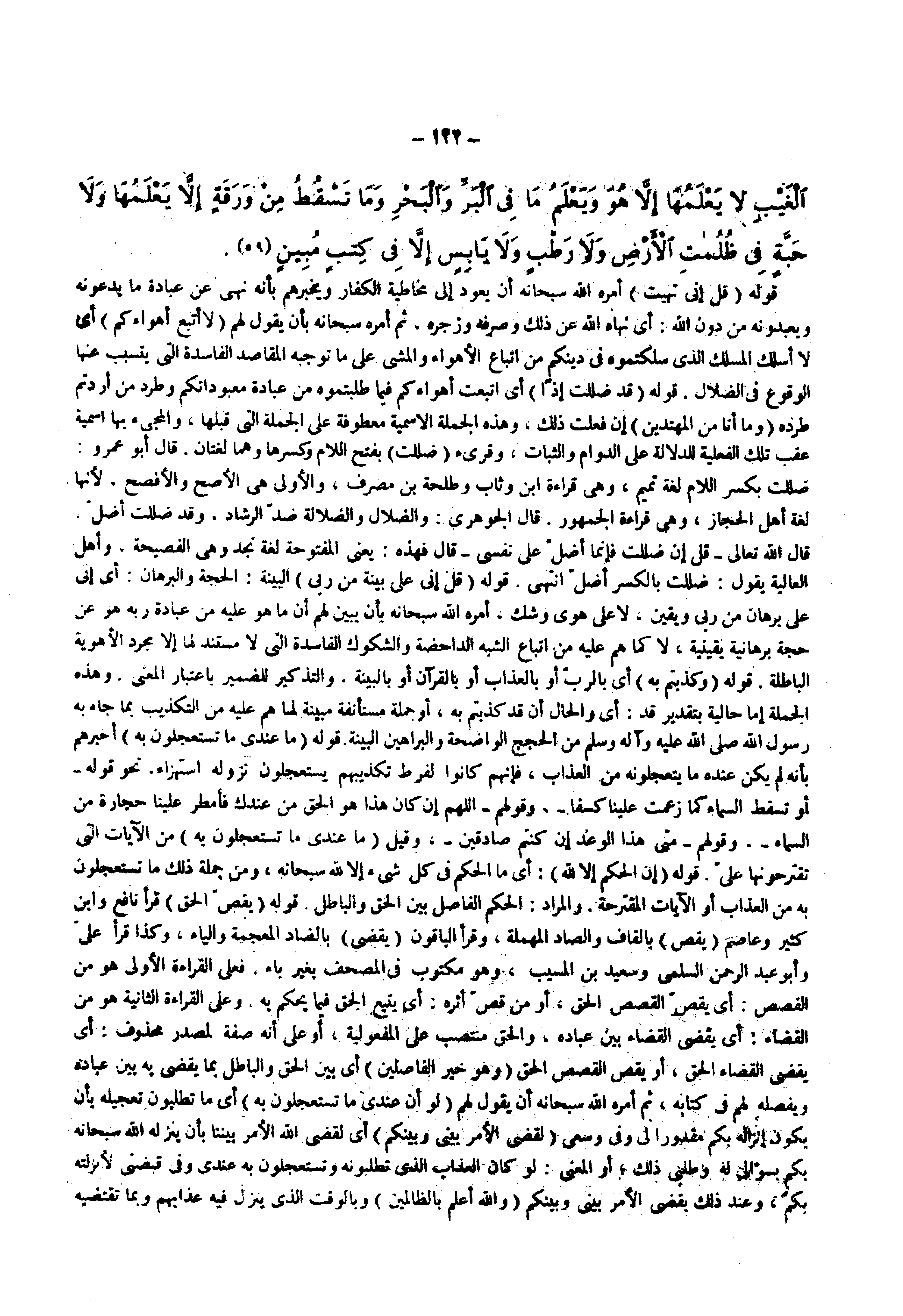 قوله ) قل إني على بينة من ربي ( البينة الحجة والبرهان أي إني على برهان من ربي ويقين لا على هوى وشك أمره الله سبحانه بأن يبين لهم أن ما هو عليه من عبادة ربه هو عن حجة برهانية يقينية لا كما هم عليه من اتباع الشبه الداحضة والشكوك الفاسدة التى لا مستند لها إلا مجرد الأهوية الباطلة قوله ) وكذبتم به ( أي بالرب أو بالعذاب أو بالقرآن أو بالبينة والتذكير للضمير باعتبار المعنى وهذه الجملة إما حالية بتقدير قد أي والحال أن قد كذبتم به أو جملة مستأنفة مبينة لما هم عليه من التكذيب بما جاء به رسول الله ( صلى الله عليه وسلم ) من الحجج الواضحة والبراهين البينة قوله ) ما عندي ما تستعجلون به ( أخبرهم بأنه لم يكن عنده ما يتعجلونه من العذاب فإنهم كانوا لفرط تكذيبهم يستعجلون نزوله استهزاء نحو قوله ) أو تسقط السماء كما زعمت علينا كسفا ( وقولهم ) اللهم إن كان هذا هو الحق من عندك فأمطر علينا حجارة من السماء ( وقولهم ) متى هذا الوعد إن كنتم صادقين ( وقيل ) ما عندي ما تستعجلون به ( من الآيات التى تقترحونها علي قوله ) إن الحكم إلا لله ( أي ما الحكم في كل شيء إلا لله سبحانه ومن جملة ذلك ما تستعجلون به من العذاب أو الآيات المقترحة والمراد الحكم الفاصل بين الحق والباطل قوله ) يقص الحق ( قرأ نافع وابن كثير وعاصم ) يقص ( بالقاف والصاد المهملة وقرأ الباقون ) يقضي ( بالضاد المعجمة والياء وكذا قرأ علي وأبو عبد الرحمن السلمي وسعيد بن المسيب وهو مكتوب في المصحف بغير ياء فعلى القراءة الأولى هو من القصص أي يقص القصص الحق أو من قص أثره أي يتبع الحق فيما يحكم به وعلى القراءة الثانية هو من القضاء أي يقضى القضاء بين عباده والحق منتصب على المفعولية أو على أنه صفة لمصدر محذوف أي يقضى القضاء الحق أو يقص القصص الحق ) وهو خير الفاصلين ( أي بين الحق والباطل بما يقتضى به بين عباده ويفصله لهم في كتابه