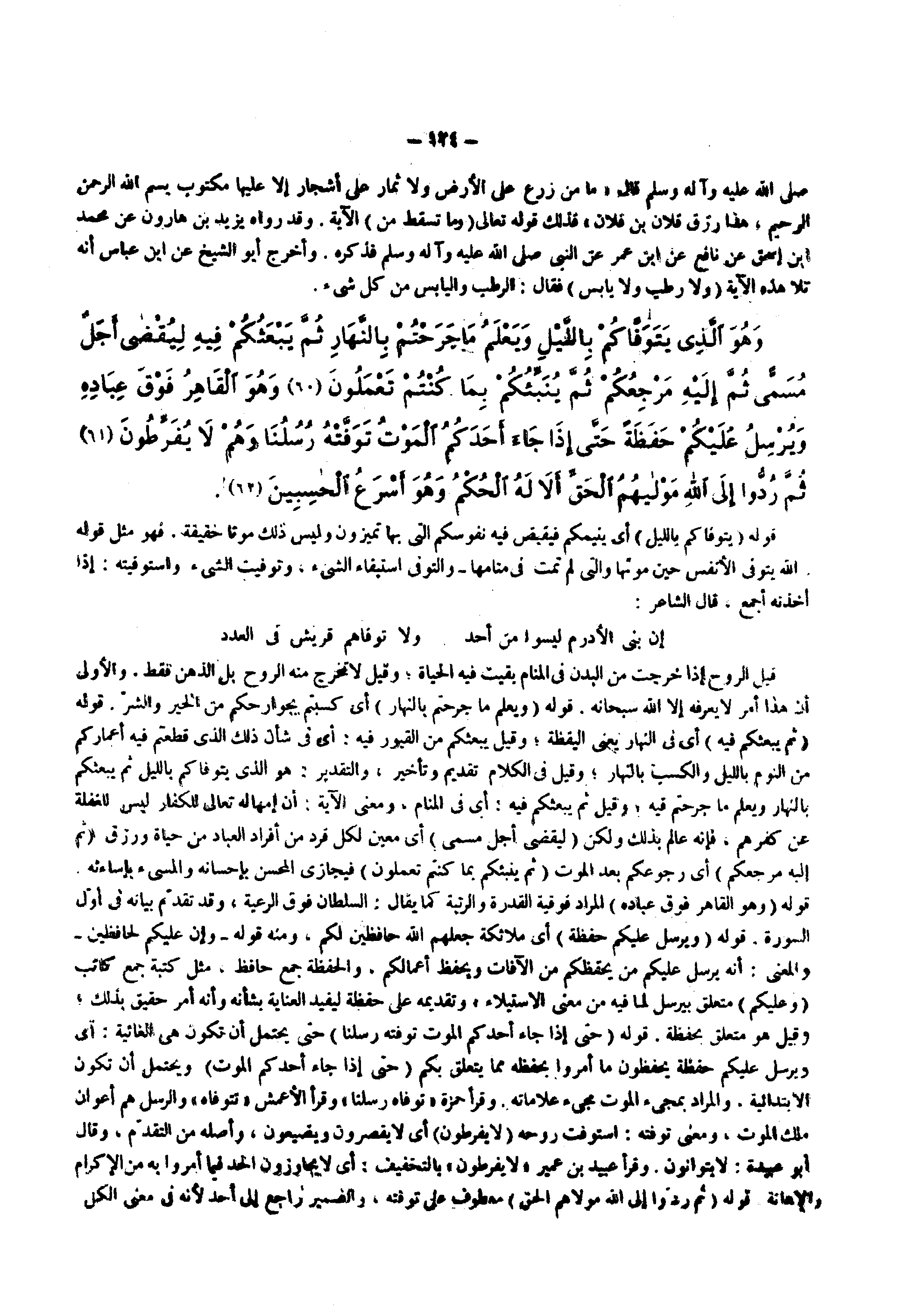 قيل الروح إذا خرجت من البدن في ا لمنام بقيت فيه الحياة وقيل لا تخرج منه الروح بل الذهن فقط والأولى أن هذا أمر لا يعرفه إلا الله سبحانه قوله ) ويعلم ما جرحتم بالنهار ( أي كسبتم بجوارحكم من الخير والشر قوله ) ثم يبعثكم فيه ( أي فى النهار يعني اليقظة وقيل يبعثكم من القبور فيه أي فى شأن ذلك الذي قطعتم فيه أعماركم من النوم بالليل والكسب بالنهار وقيل فى الكلام تقديم وتأخير والتقدير هو الذي يتوفاكم بالليل ثم يبعثكم بالنهار ويعلم ما جرحتم فيه وقيل ثم يبعثكم فيه أي فى المنام ومعنى الآية أن إمهاله تعالى للكفار ليس للغفلة عن كفرهم فإنه عالم بذلك ولكن ) ليقضى أجل مسمى ( أي معين لكل فرد من أفراد العباد من حياة ورزق ) ثم إليه مرجعكم ( أي رجوعكم بعد الموت ) ثم ينبئكم بما كنتم تعملون ( فيجازى المحسن بإحسانه والمسيء بإساءته