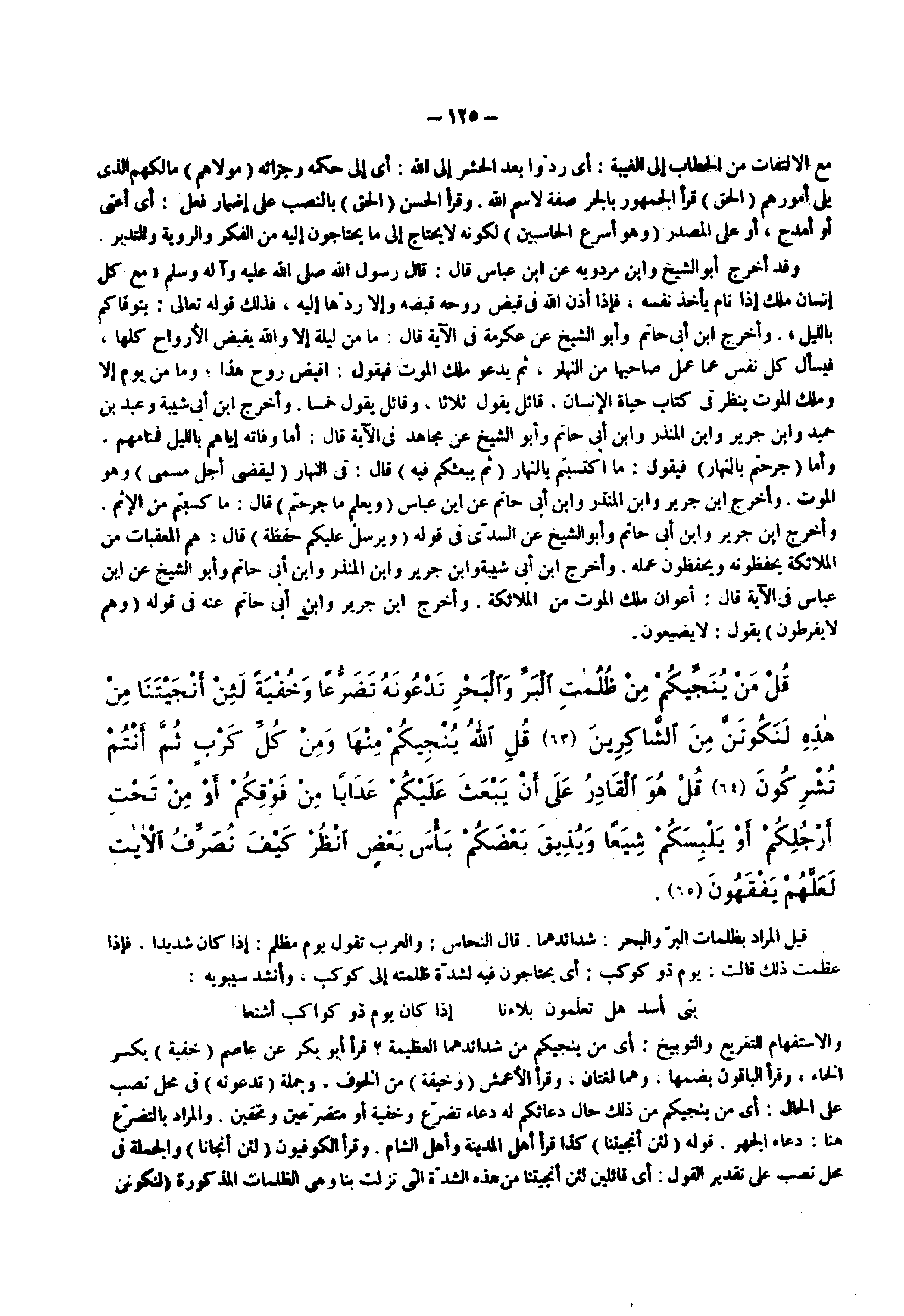 والاستفهام للتقريع والتوبيخ أي من ينجيكم من شدائدهما العظيمة قرأ أبو بكر عن عاصم ? خفية ? بكسر الخاء وقرأ الباقون بضمها وهما لغتان وقرأ الأعمش ) وخيفة ( من الخوف وجملة ) تدعونه ( في محل نصب على الحال أي من ينجيكم من ذلك حال دعائكم له دعاء تضرع وخفية أو متضرعين ومخفين والمراد بالتضرع هنا دعاء الجهر قوله ) لئن أنجيتنا ( كذا قرأ أهل المدينة وأهل الشام وقرأ الكوفيون ) لئن أنجانا ( والجملة فى محل نصب على تقدير القول أي قائلين لئن أنجيتنا من هذه الشدة التى نزلت بنا وهى الظلمات المذكورة ) لنكونن من الشاكرين (