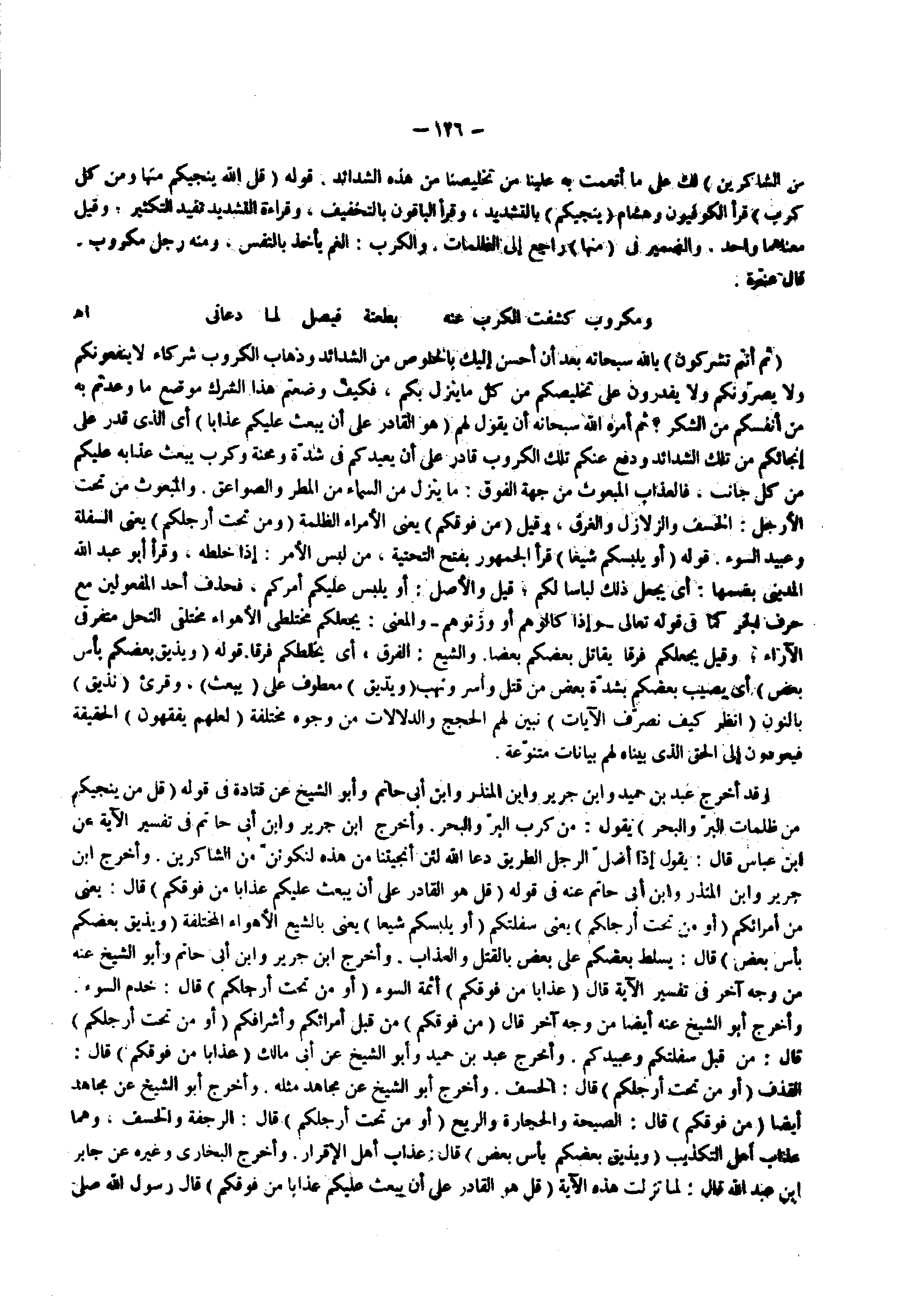 وقد أخرج عبد بن حميد وابن جرير وابن المنذر وابن أبي حاتم وأبو الشيخ عن قتادة فى قوله ) قل من ينجيكم من ظلمات البر والبحر ( يقول من كرب البر والبحر وأخرج ابن جرير وابن أبي حاتم فى تفسير الآية عن ابن عباس قال يقول إذا أضل الرجل الطريق دعا الله لئن أنجيتنا من هذه لنكونن من الشاكرين وأخرج ابن جرير وابن المنذر وابن أبي حاتم عنه فى قوله ) قل هو القادر على أن يبعث عليكم عذابا من فوقكم ( قال يعني من أمرائكم ) أو من تحت أرجلكم ( يعني سفلتكم ) أو يلبسكم شيعا ( يعني بالشيع الأهواء المختلفة ) ويذيق بعضكم بأس بعض ( قال يسلط بعضكم على بعض بالقتل والعذاب وأخرج ابن جرير وابن أبي حاتم وأبو الشيخ عنه من وجه آخر في تفسير الآية قال ) عذابا من فوقكم ( أئمة السوء ) أو من تحت أرجلكم ( قال خدم السوء وأخرج أبو الشيخ عنه أيضا من وجه آخر قال ) من فوقكم ( من قبل أمرائكم وأشرافكم ) أو من تحت أرجلكم ( قال من قبل سفلتكم وعبيدكم وأخرج عبد بن حميد وأبو الشيخ عن أبي مالك ) عذابا من فوقكم ( قال القذف ) أو من تحت أرجلكم ( قال الخسف وأخرج أبو الشيخ عن مجاهد مثله وأخرج أبو الشيخ عن مجاهد أيضا ) من فوقكم ( قال الصيحة والحجارة والريح ) أو من تحت أرجلكم ( قال الرجفة والخسف وهما عذاب أهل التكذيب ) ويذيق بعضكم بأس بعض ( قال عذاب أهل الإقرار وأخرج البخاري وغيره عن جابر ابن عبد الله قال لما نزلت هذه الآية ) قل هو القادر على أن يبعث عليكم عذابا من فوقكم ( قال رسول الله صلى