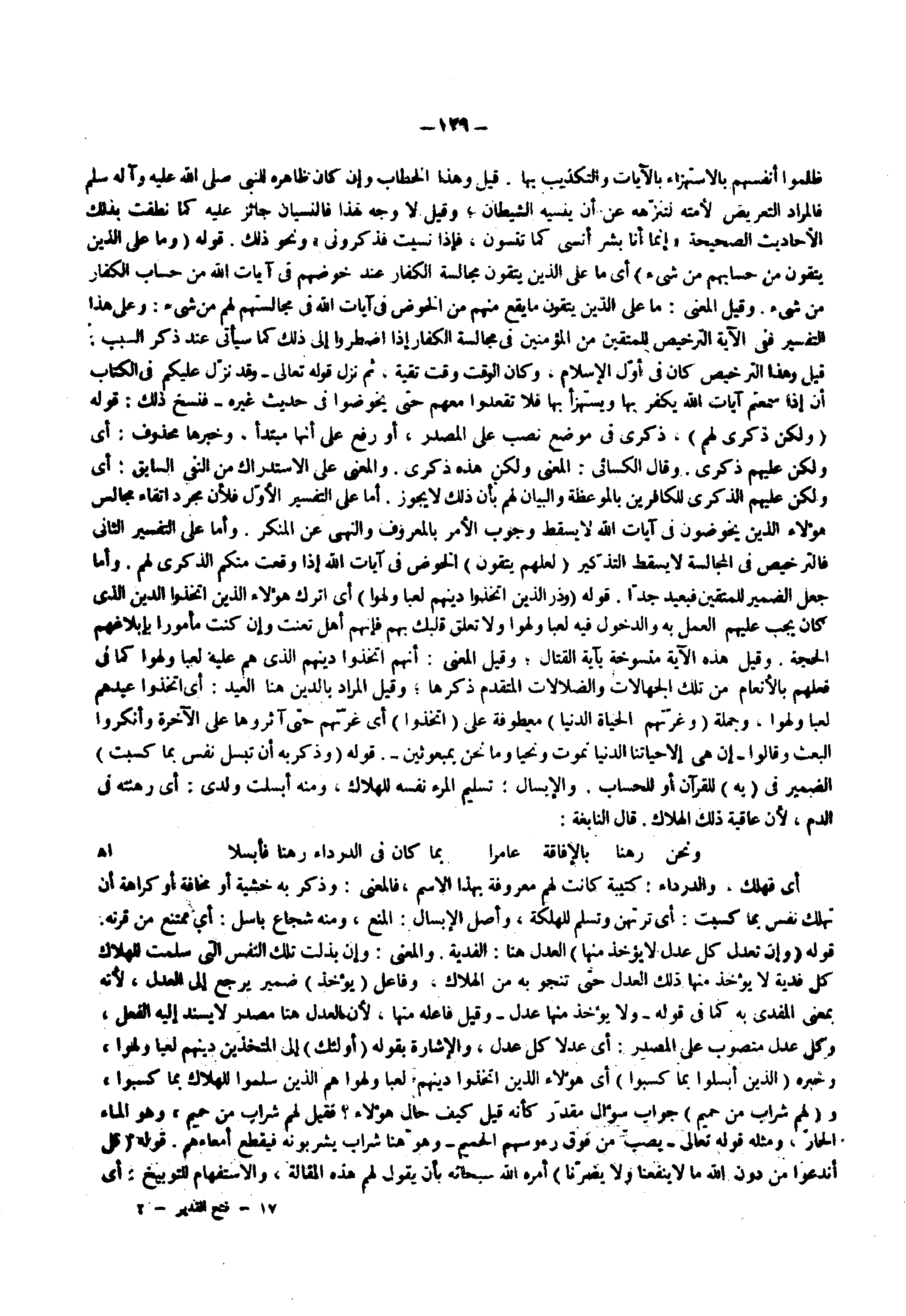 قوله ) وذر الذين اتخذوا دينهم لعبا ولهوا ( أي اترك هؤلاء الذين اتخذوا الدين الذى كان يجب عليهم العمل به والدخول فيه لعبا ولهوا ولا تعلق قلبك بهم فإنهم أهل تعنت وإن كنت مأمورا بإبلاغهم الحجة وقيل هذه الآية منسوخة بآية القتال وقيل المعنى أنهم اتخذوا دينهم الذى هم عليه لعبا ولهوا كما فى فعلهم بالأنعام من تلك الجهالات والضلالات المتقدم ذكرها وقيل المراد بالدين هنا العيد أي اتخذوا عيدهم لعبا ولهوا وجملة ) وغرتهم الحياة الدنيا ( معطوفة على ) اتخذوا ( أي غرتهم حتى آثروها على الآخرة وأنكروا البعث وقالوا ) إن هي إلا حياتنا الدنيا نموت ونحيا وما نحن بمبعوثين ( قوله ) وذكر به أن تبسل نفس بما كسبت ( الضمير فى به للقرآن أو للحساب والإبسال تسليم المرء نفسه للهلاك ومنه أبسلت ولدي أي رهنته فى الدم لأن عاقبة ذلك الهلاك قال النابغة ونحن رهنا بالإفاقة عامرا
