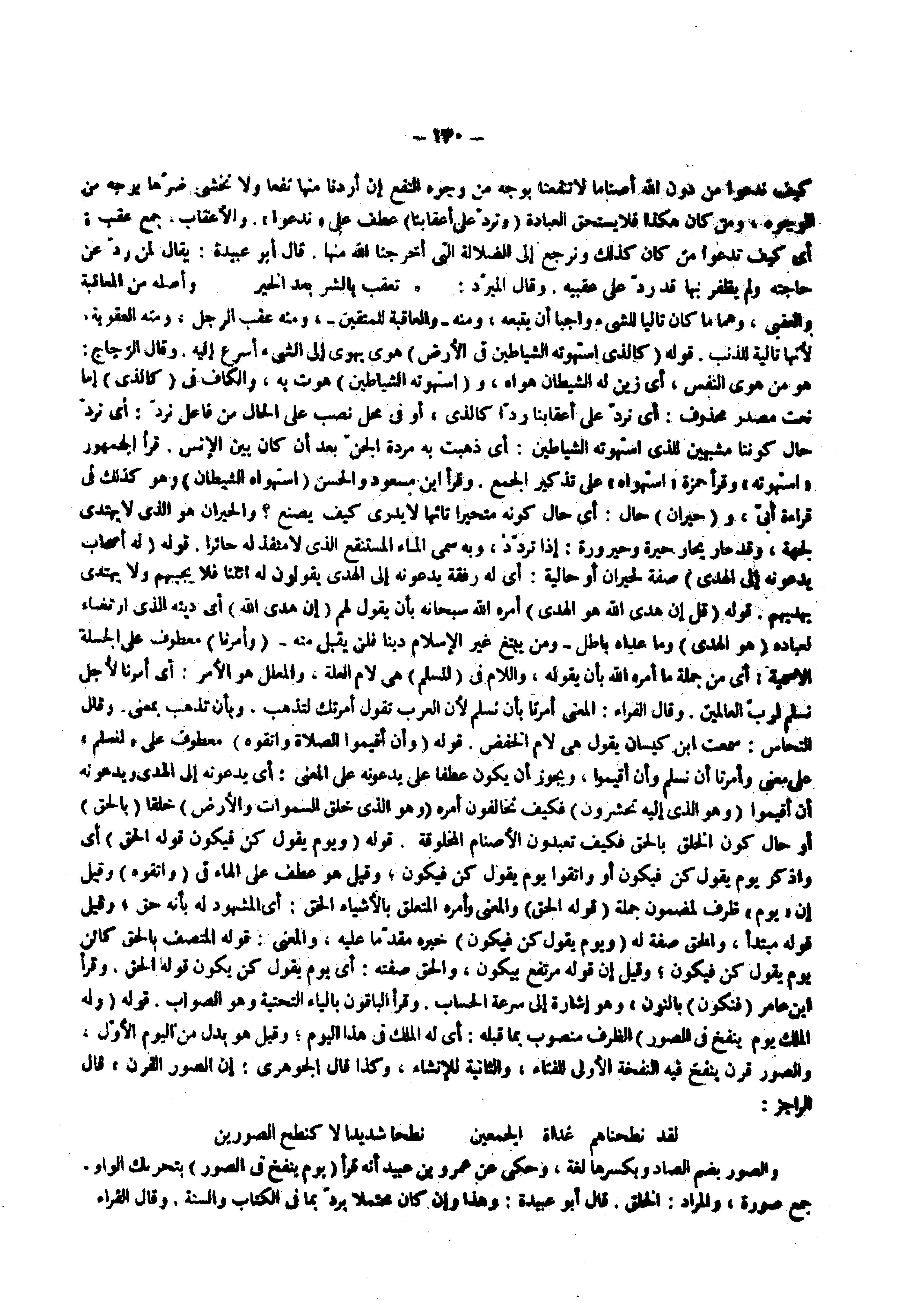 ) وهو الذي خلق السماوات والأرض ( خلقا ) بالحق ( أو حال كون الخلق بالحق فكيف تعبدون الأصنام المخلوقة قوله ) ويوم يقول كن فيكون قوله الحق ( أي واذكر يوم يقول كن فيكون أو واتقوا يوم يقول كن فيكون وقيل هو عطف على الهاء فى ) واتقوه ( وقيل إن ) يوم ( ظرف لمضمون جملة ) قوله الحق ( والمعنى وأمره المتعلق بالأشياء الحق أي المشهود له بأنه حق وقيل قوله مبتدأ والحق صفة له ) ويوم يقول كن فيكون ( خبره مقدما عليه والمعنى قوله المتصف بالحق كائن يوم يقول كن فيكون وقيل إن قوله مرتفع بيكون والحق صفته أي يوم يقول كن فيكون قوله الحق وقرأ ابن عامر ) فنكون ( بالنون وهو إشارة إلى سرعة الحساب وقرأ الباقون بالياء التحتية وهو الصواب قوله ) وله الملك يوم ينفخ في الصور ( الظرف منصوب بما قبله أي له الملك فى هذا اليوم وقيل هو بدل من اليوم الأول والصور قرن ينفخ فيه النفخة الأولى للفناء والثانية للإنشاء وكذا قال الجوهري إن الصور القرن قال الراجز