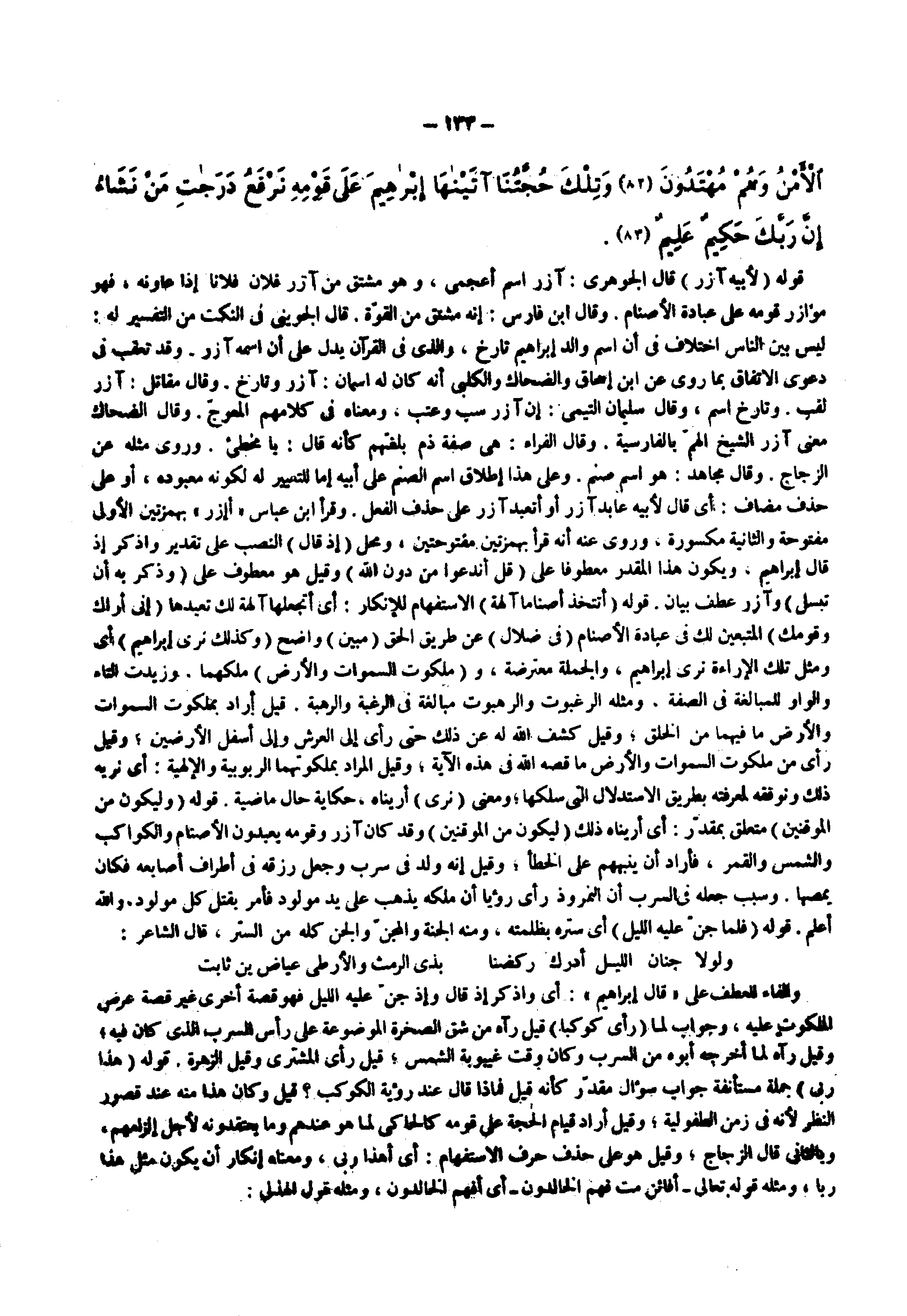 وكذلك نري إبراهيم ( أي ومثل تلك الإراءة نرى إبراهيم والجملة معترضة و ) ملكوت السماوات والأرض ( ملكهما وزيدت التاء والواو للمبالغة في الصفة ومثله الرغبوت والرهبوت مبالغة في الرغبة والرهبة قيل أراد بملكوت السموات والأرض ما فيهما من الخلق وقيل كشف الله له عن ذلك حتى رأى إلى العرش وإلى أسفل الأرضين وقيل رأى من ملكوت السموات والأرض ما قصه الله فى هذه الآية وقيل المراد بملكوتهما الربوبية والإلهية أي نريه ذلك وتوفقه لمعرفته بطريق الاستدلال التى سلكها ومعنى ) نرى ( أريناه حكاية حال ماضية قوله ) وليكون من الموقنين ( متعلق بمقدر أي أريناه ذلك ) وليكون من الموقنين ( وقد كان آزر وقومه يعبدون الأصنام والكواكب والشمس والقمر فأراد أن ينبههم على الخطأ وقيل إنه ولد في سرب وجعل رزقه في أطراف أصابعه فكان يمصها وسبب جعله في السرب أن النمروذ رأى رؤيا أن ملكه يذهب على يد مولود فأمر بقتل كل مولود والله أعلم