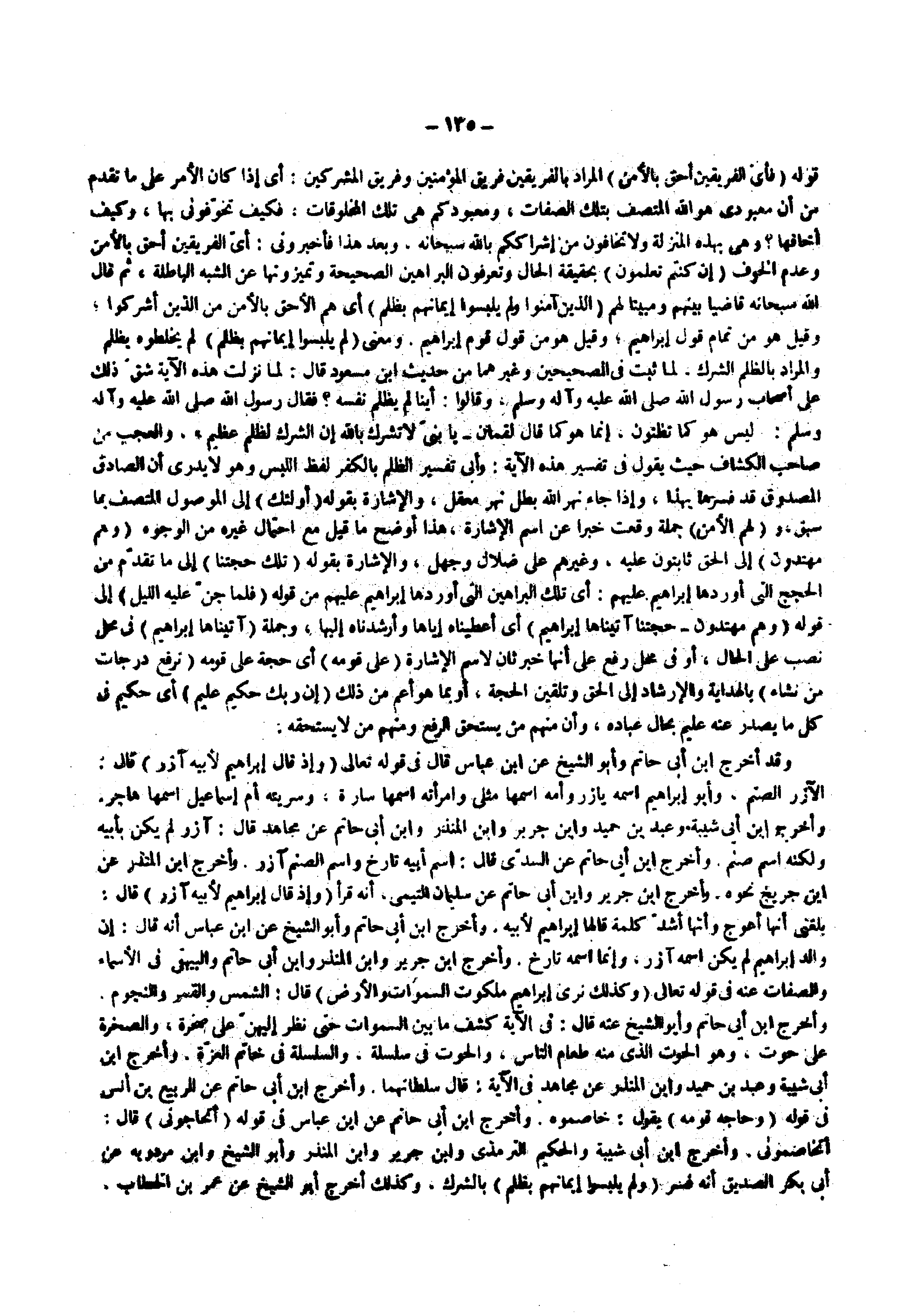 وأخرج ابن أبي حاتم وأبو الشيخ عنه قال فى الآية كشف ما بين السموات حتى نظر إليهن على صخرة والصخرة على حوت وهو الحوت الذى منه طعام الناس والحوت فى سلسلة والسلسلة في خاتم العزة وأخرج ابن أبي شيبة وعبد بن حميد وابن المنذر عن مجاهد فى الآية قال سلطانهما وأخرج ابن أبي حاتم عن الربيع بن أنس فى قوله ) وحاجه قومه ( يقول خاصموه وأخرج ابن أبي حاتم عن ابن عباس فى قوله ) أتحاجوني ( قال أتخاصموني وأخرج ابن أبي شيبة والحكيم الترمذي وابن جرير وابن المنذر وأبو الشيخ وابن مردويه عن أبي بكر الصديق أنه فسر ) ولم يلبسوا إيمانهم بظلم ( بالشرك وكذلك أخرج أبو الشيخ عن عمر بن الخطاب