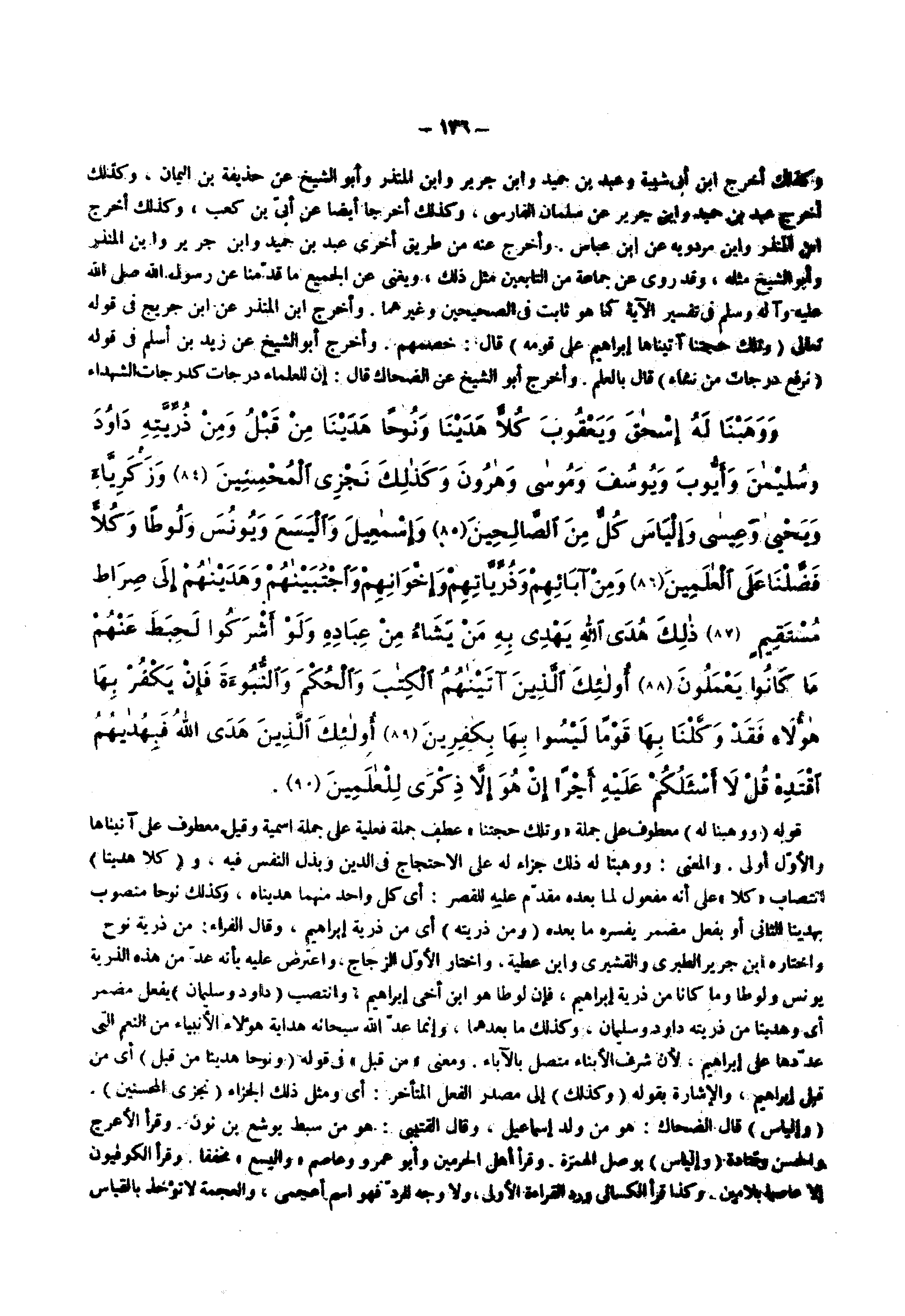 واختاره ابن جرير الطبري والقشيري وابن عطية واختار الأول الزجاج واعتراض عليه بأنه عد من هذه الذرية يونس ولوطا وما كانا من ذرية إبراهيم فإن لوطا هو ابن أخي إبراهيم وانتصب داود وسليمان بفعل مضمر أي وهدينا من ذريته داود وسليمان وكذلك ما بعدهما وإنما عد الله سبحانه هداية هؤلاء الأنبياء من النعم التى عددها على إبراهيم لأن شرف الأبناء متصل بالآباء ومعنى ) من قبل ( فى قوله ) ونوحا هدينا من قبل ( أي من قبل إبراهيم والإشارة بقوله ) وكذلك ( إلى مصدر الفعل المتأخر أي ومثل ذلك الجزاء ) نجزي المحسنين (