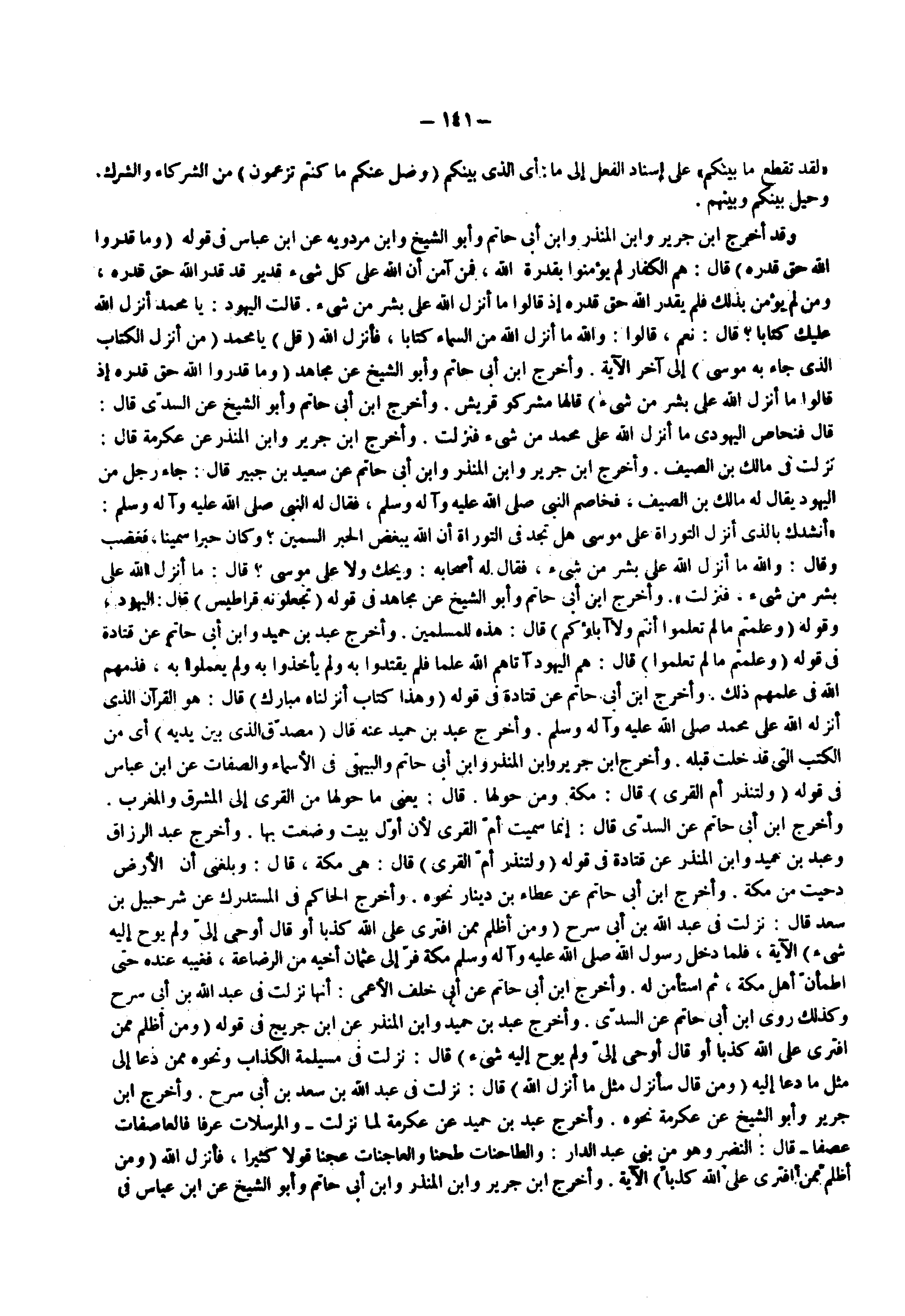 وقد أخرج ابن جرير وابن المنذر وابن أبي حاتم وأبو الشيخ وابن مردويه عن ابن عباس فى قوله ) وما قدروا الله حق قدره ( قال هم الكفار لم يؤمنوا بقدرة الله فمن آمن أن الله على كل شيء قدير قد قدر الله حق قدره ومن لم يؤمن بذلك فلم يقدر الله حق قدره إذ قالوا ما أنزل الله على بشر من شيء قالت اليهود يا محمد أنزل الله عليك كتابا قال نعم قالوا والله ما أنزل الله من السماء كتابا فأنزل الله ) قل ( يا محمد ) من أنزل الكتاب الذي جاء به موسى ( إلى آخر الآية وأخرج ابن أبي حاتم وأبو الشيخ عن مجاهد ) وما قدروا الله حق قدره إذ قالوا ما أنزل الله على بشر من شيء ( قالها مشركو قريش وأخرج ابن أبي حاتم وأبو الشيخ عن السدي قال قال فنحاص اليهودي ما أنزل الله على محمد من شيء فنزلت وأخرج ابن جرير وابن المنذر عن عكرمة قال نزلت في مالك بن الصيف وأخرج ابن جرير وابن المنذر وابن أبي حاتم عن سعيد بن جبير قال جاء رجل من اليهود يقال له مالك بن الصيف فخاصم النبي ( صلى الله عليه وسلم ) فقال له النبي ( صلى الله عليه وسلم ) أنشدك بالذى أنزل التوراة على موسى هل تجد فى التوراة أن الله يبغض الحبر السمين وكان حبرا سمينا فغضب وقال والله ما أنزل الله على بشر من شيء فقال له أصحابه ويحك ولا على موسى قال ما أنزل الله على بشر من شيء فنزلت وأخرج ابن أبي حاتم وأبو الشيخ عن مجاهد فى قوله ) تجعلونه قراطيس ( قال اليهود وقوله ) وعلمتم ما لم تعلموا أنتم ولا آباؤكم ( قال هذه للمسلمين وأخرج عبد بن حميد وابن أبي جاتم عن قتادة فى قوله ) وعلمتم ما لم تعلموا ( قال هم اليهود آتاهم الله علما فلم يقتدوا به ولم يأخذوا به ولم يعملوا به فذمهم الله في علمهم ذلك وأخرج ابن أبي حاتم عن قتادة فى قوله ) وهذا كتاب أنزلناه مبارك ( قال هو القرآن الذى أنزل الله علي محمد ( صلى الله عليه وسلم ) وأخرج عبد بن حميد عنه قال ) مصدق الذي بين يديه ( أي من الكتب التى قد خلت قبله وأخرج ابن جرير وابن المنذر وابن أبي حاتم والبيهقي فى الأسماء والصفات عن ابن عباس فى قوله ) ولتنذر أم القرى ( قال مكة ومن حولها قال يعني ما حولها من القرى إلى المشرق والمغرب