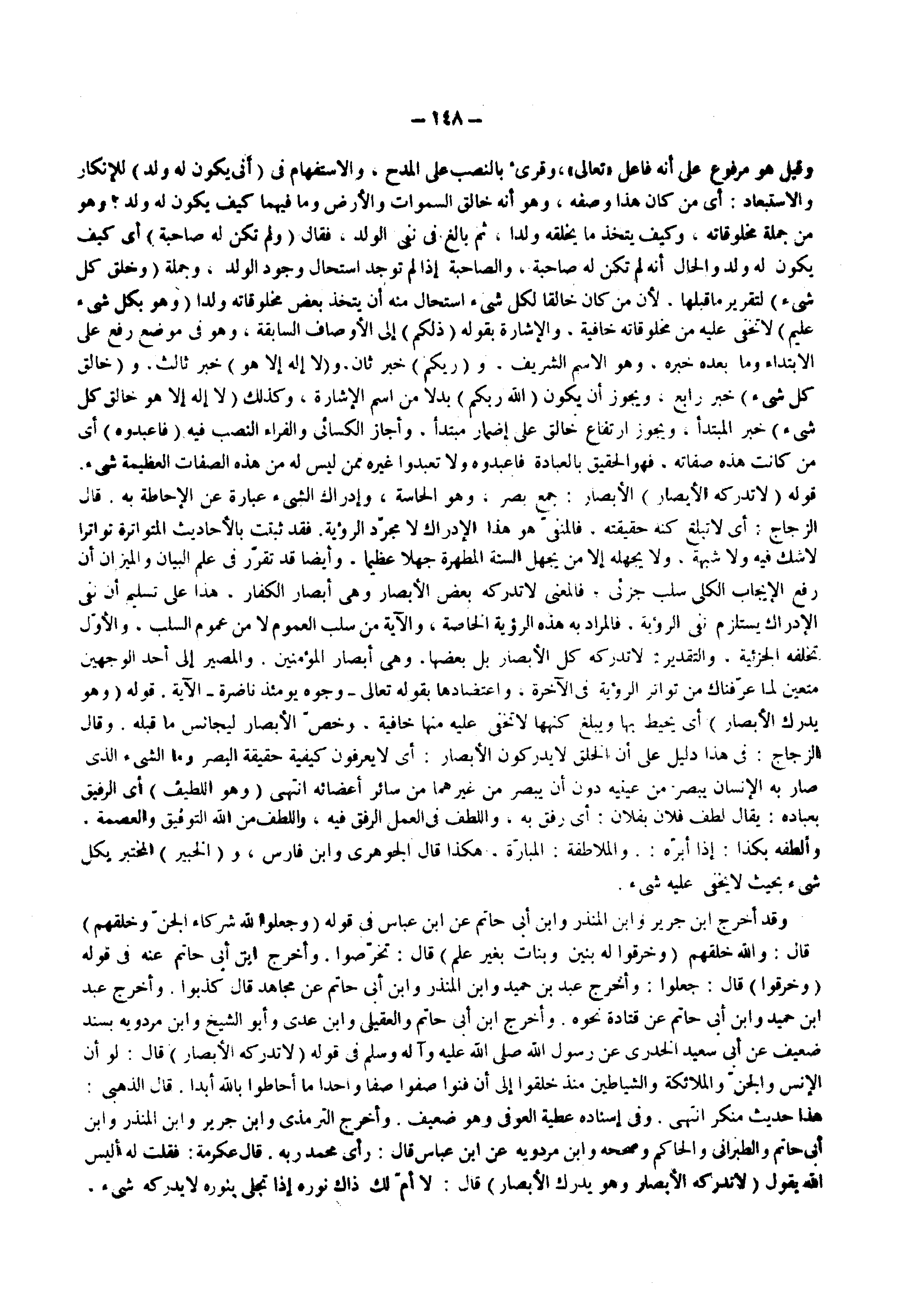 وقد أخرج ابن جرير وابن المنذر وابن أبي حاتم عن ابن عباس فى قوله ) وجعلوا لله شركاء الجن وخلقهم ( قال والله خلقهم ) وخرقوا له بنين وبنات بغير علم ( قال تخرصوا وأخرج ابن أبي حاتم عنه فى قوله ) وخرقوا ( قال جعلوا وأخرج عبد بن حميد وابن المنذر وابن أبي حاتم عن مجاهد قال كذبوا وأخرج عبد ابن حميد وابن أبي حاتم عن قتادة نحوه وأخرج ابن أبي حاتم والعقيلي وابن عدي وأبو الشيخ وابن مردويه بسند ضعيف عن أبي سعيد الخدري عن رسول الله ( صلى الله عليه وسلم ) فى قوله ) لا تدركه الأبصار ( قال لو أن الإنس والجن والملائكة والشياطين منذ خلقوا إلى أن فنوا صفوا صفا واحدا ما أحاطوا بالله أبدا قال الذهبي هذا حديث منكر انتهى وفي إسناده عطية العوفي وهو ضعيف وأخرج الترمذي وابن جرير وابن المنذر وابن أبي حاتم والطبراني والحاكم وصححه وابن مردويه عن ابن عباس قال رأى محمد ربه قال عكرمة فقلت له أليس الله يقول ) لا تدركه الأبصار وهو يدرك الأبصار ( قال لا أم لك ذاك نوره إذا تجلى بنوره لا يدركه شيء