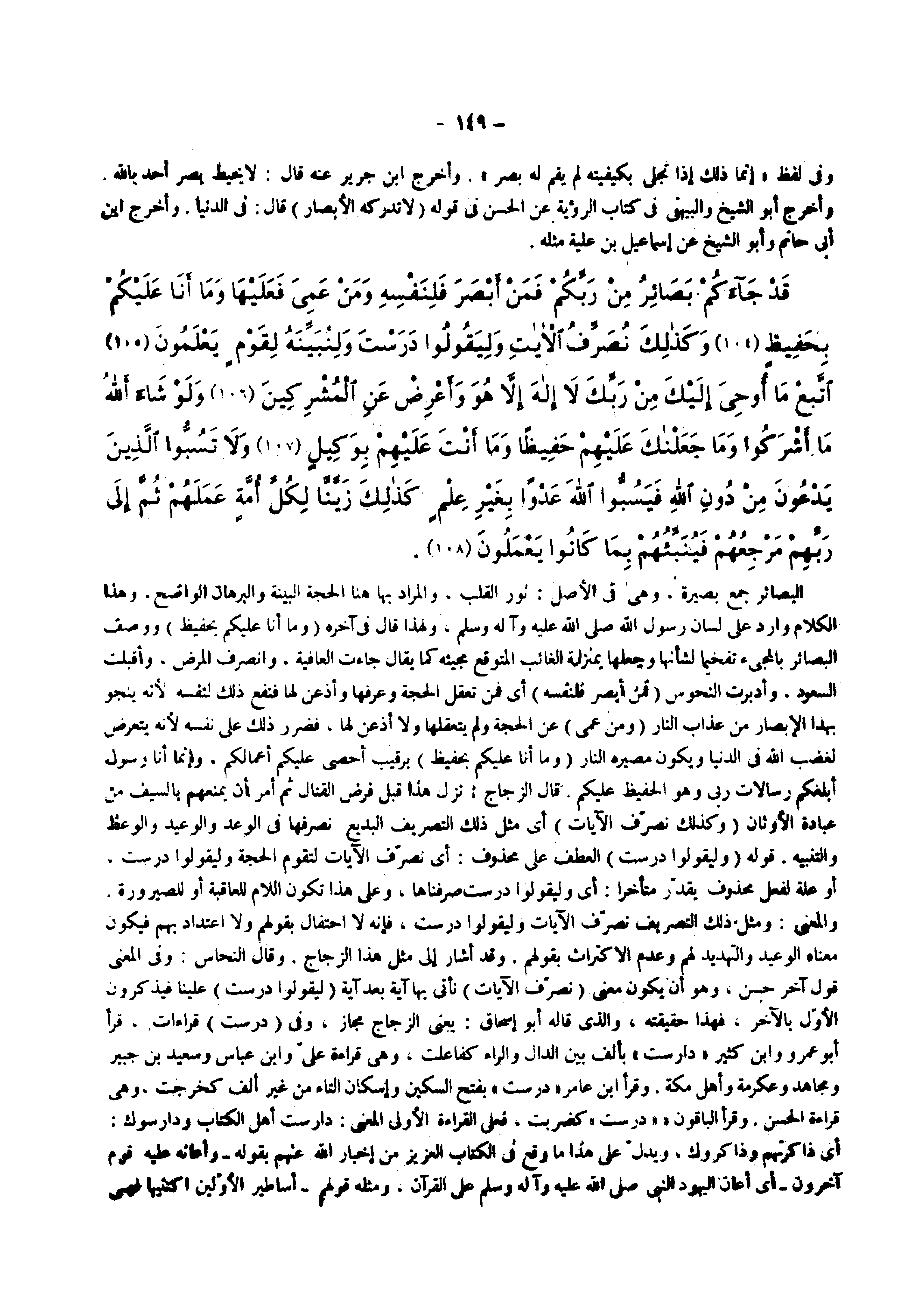 والمعنى ومثل ذلك التصريف نصرف الآيات وليقولوا درست فإنه لا احتفال بقولهم ولا اعتداد بهم فيكون معناه الوعيد والتهديد لهم وعدم الاكتراث بقولهم وقد أشار إلى مثل هذا الزجاج وقال النحاس وفي المعنى قول آخر حسن وهو أن يكون معنى ) نصرف الآيات ( نأتي بها آية بعد آية ) وليقولوا درست ( علينا فيذكرون الأول بالآخر فهذا حقيقته والذى قاله أبو إسحاق يعني الزجاج مجاز وفى ) درست ( قراءات قرأ أبو عمرو وابن كثير دارست بألف بين الدال والراء كفاعلت وهى قراءة علي وابن عباس وسعيد بن جبير ومجاهد وعكرمة وأهل مكة وقرأ ابن عامر ) درست ( بفتح السكين وإسكان التاء من غير ألف كخرجت وهى قراءة الحسن وقرأ الباقون ) درست ( كضربت فعلى القراءة الأولى المعنى دارست أهل الكتاب ودارسوك أي ذاكرتهم وذاكروك ويدل على هذا ما وقع فى الكتاب العزيز من إخبار الله عنهم بقوله ) وأعانه عليه قوم آخرون ( أي أعان اليهود النبي ( صلى الله عليه وسلم ) على القرآن ومثله قولهم ) أساطير الأولين اكتتبها فهي تملى عليه بكرة وأصيلا (