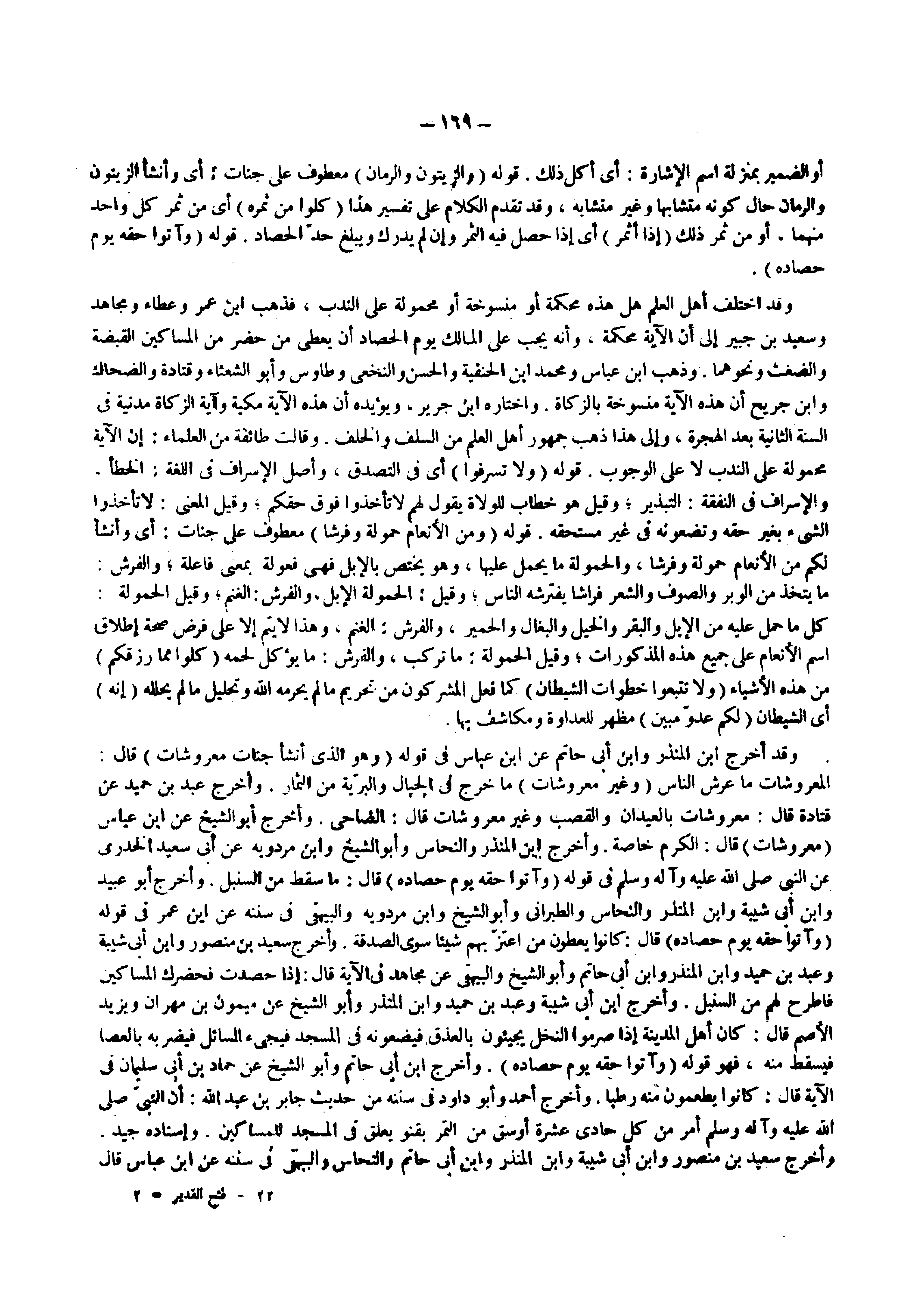 وقد اختلف أهل العلم هل هذه محكمة أو منسوخة أو محمولة على الندب فذهب ابن عمر وعطاء ومجاهد وسعيد بن جبير إلى أن الآية محكمة وأنه يجب على المالك يوم الحصاد أن يعطى من حضر من المساكين القبضة والضغث ونحوهما وذهب ابن عباس ومحمد ابن الحنفية والحسن والنخعي وطاوس وأبو الشعثاء وقتادة والضحاك وابن جريح أن هذه الآية منسوخة بالزكاة وأختاره ابن جرير ويؤيده أن هذه الآية مكية وآيه الزكاة مدنية فى السنة الثانية بعد الهجرة وإلى هذا ذهب جمهور أهل العلم من السلف والخلف وقالت طائفة من العلماء إن الآية محمولة على الندب لا على الوجوب قوله ) ولا تسرفوا ( أي فى التصدق وأصل الإسراف فى اللغة الخطأ والإسراف في النفقة التبذير وقيل هو خطاب للولاة يقول لهم لا تأخذوا فوق حقكم وقيل المعنى لا تأخذوا الشيء بغير حقه وتضعونه فى غير مستحقه