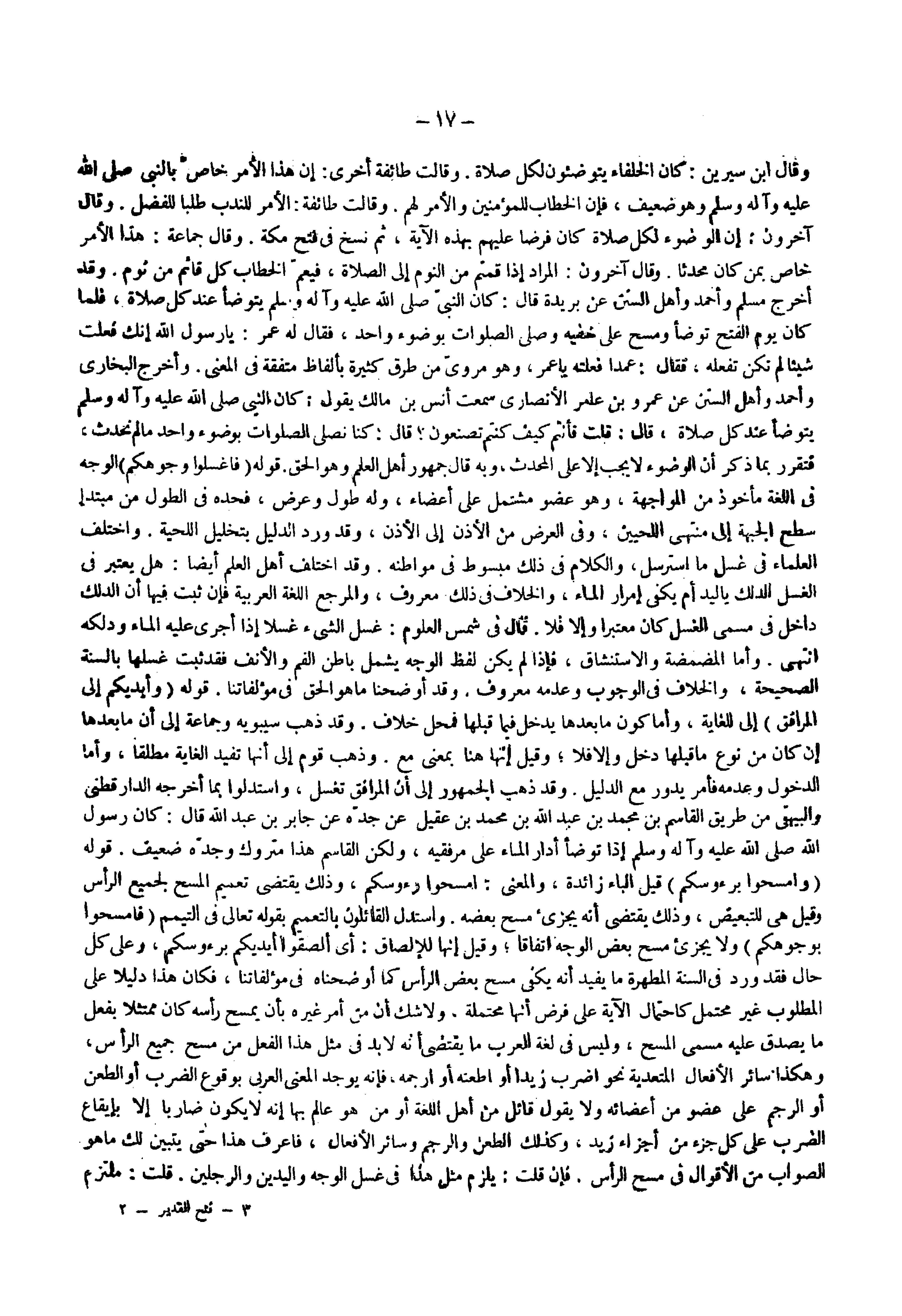 وقال ابن سيرين كان الخلفاء يتوضئون لكل صلاة وقالت طائفة أخرى إن هذا الأمر خاص بالنبي ( صلى الله عليه وسلم ) وهو ضعيف فإن الخطاب للمؤمنين والأمر لهم وقالت طائفة الأمر للندب طلبا للفضل وقال آخرون إن الوضوء لكل صلاة كان فرضا عليهم بهذه الآية ثم نسخ في فتح مكة وقال جماعة هذا الأمر خاص بمن كان محدثا وقال آخرون المراد إذا قمتم من النوم إلى الصلاة فيعم الخطاب كل قائم من نوم وقد أخرج مسلم وأحمد وأهل السنن عن بريدة قال كان النبي ( صلى الله عليه وسلم ) يتوضأ عن كل صلاة فلما كان يوم الفتح توضأ ومسح على خفيه وصلى الصلوات بوضوء واحد فقال له عمر يا رسول الله إنك فعلت شيئا لم تكن تفعله فقال عمدا فعلته يا عمر وهو مروى من طرق كثيرة بألفاظ متفقة في المعنى وأخرج البخاري وأحمد وأهل السنن عن عمرو بن عامر الأنصاري سمعت أنس بن مالك يقول كان النبي ( صلى الله عليه وسلم ) يتوضأ عند كل صلاة قال قلت فأنتم كيف كنتم تصنعون قال كنا نصلى الصلوات بوضوء واحد ما لم نحدث فتقرر بما ذكر أن الوضوء لا يجب إلا على المحدث به وبه قال جمهور أهل العلم وهو الحق قوله ) فاغسلوا وجوهكم ( الوجه في اللغة مأخوذ من المواجهة وهو عضو مشتمل على أعضاء وله طول وعرض فحده فى الطول من مبتدا سطح الجبهة إلى منتهى اللحيين وفى العرض من الأذن إلى الأذن وقد ورد الدليل بتخليل اللحية واختلف العلماء فى غسل ما استرسل والكلام فى ذلك مبسوط في مواطنه وقد اختلف أهل العلم أيضا هل يعتبر في الغسل الدلك باليد أم يكفى إمرار الماء والخلاف في ذلك معروف والمرجع اللغة العربية فإن ثبت فيها أن الدلك داخل في مسمى الغسل كان معتبرا وإلا فلا قال في شمس العلوم غسل الشيء غسلا إذا أجرى عليه الماء ودلكه انتهى وأما المضمضة والاستنشاق فإذا لم يكن لفظ الوجه يشمل باطن الفم والأنف فقد ثبت غسلها بالسنة الصحيحة والخلاف في الوجوب وعدمه معروف وقد أوضحنا ما هو الحق في مؤلفاتنا قوله ) وأيديكم إلى المرافق ( إلى للغاية وأما كون ما بعدها يدخل فيما قبلها فمحل خلاف وقد ذهب سيبويه وجماعة إلى أن ما بعدها إن كان من نوع ما قبلها دخل وإلا فلا وقيل إنها هنا بمعنى مع وذهب قوم إلى أنها تفيد الغاية مطلقا وأما الدخول وعدمه فأمر يدور مع الدليل وقد ذهب الجمهور إلى أن المرافق تغسل واستدلوا بما أخرجه الدارقطني والبيهقي من طريق القاسم بن محمد بن عبد الله بن محمد بن عقيل عن جده عن جابر بن عبد الله قال كان رسول الله ( صلى الله عليه وسلم ) إذا توضأ أدار الماء على مرفقيه ولكن القاسم هذا متروك وجده ضعيف قوله ) وامسحوا برؤوسكم ( قيل الباء زائدة والمعنى امسحوا رءوسكم وذلك يقتضى تعميم المسح لجميع الرأس وقيل هى للتبعيض وذلك يقتضى أنه يجزئ مسح بعضه واستدل القائلون بالتعميم بقوله تعالى في التيمم فامسحوا بوجوهكم ولا يجزيء مسح بعض الوجه اتفاقا وقيل أنها للإلصاق أي ألصقوا أيديكم برءوسكم وعلى كل حال فقد ورد في السنة المطهرة ما يفيد انه يكفي مسح بعض الرأس كما أوضحناه فى مؤلفاتنا فكان هذا دليلا على المطلوب غير محتمل كاحتمال الآية على فرض أنها محتملة ولا شك أن من أمر غيره بأن يمسح رأسه كان ممتثلا بفعل ما يصدق عليه مسمى المسح وليس فى لغة العرب ما يقتضى أنه لا بد فى مثل هذا الفعل من مسح جميع الرأس وهكذا سائر الأفعال المتعدية نحو اضرب زيدا أو اطعنه أو ارجمه فإنه يوجد المعنى العربي بوقوع الضرب أو الطعن أو الرجم على عضو من أعضائه ولا يقول قائل من أهل اللغة أو من هو عالم بها إنه لا يكون ضاربا إلا بإيقاع الضرب على كل جزء من أجزاء زيد وكذلك الطعن والرجم وسائر الأفعال فاعرف هذا حتى يتبين لك ما هو الصواب من الأقوال في مسح الرأس فإن قلت يلزم مثل هذا في غسل الوجه واليدين والرجلين قلت ملتزم