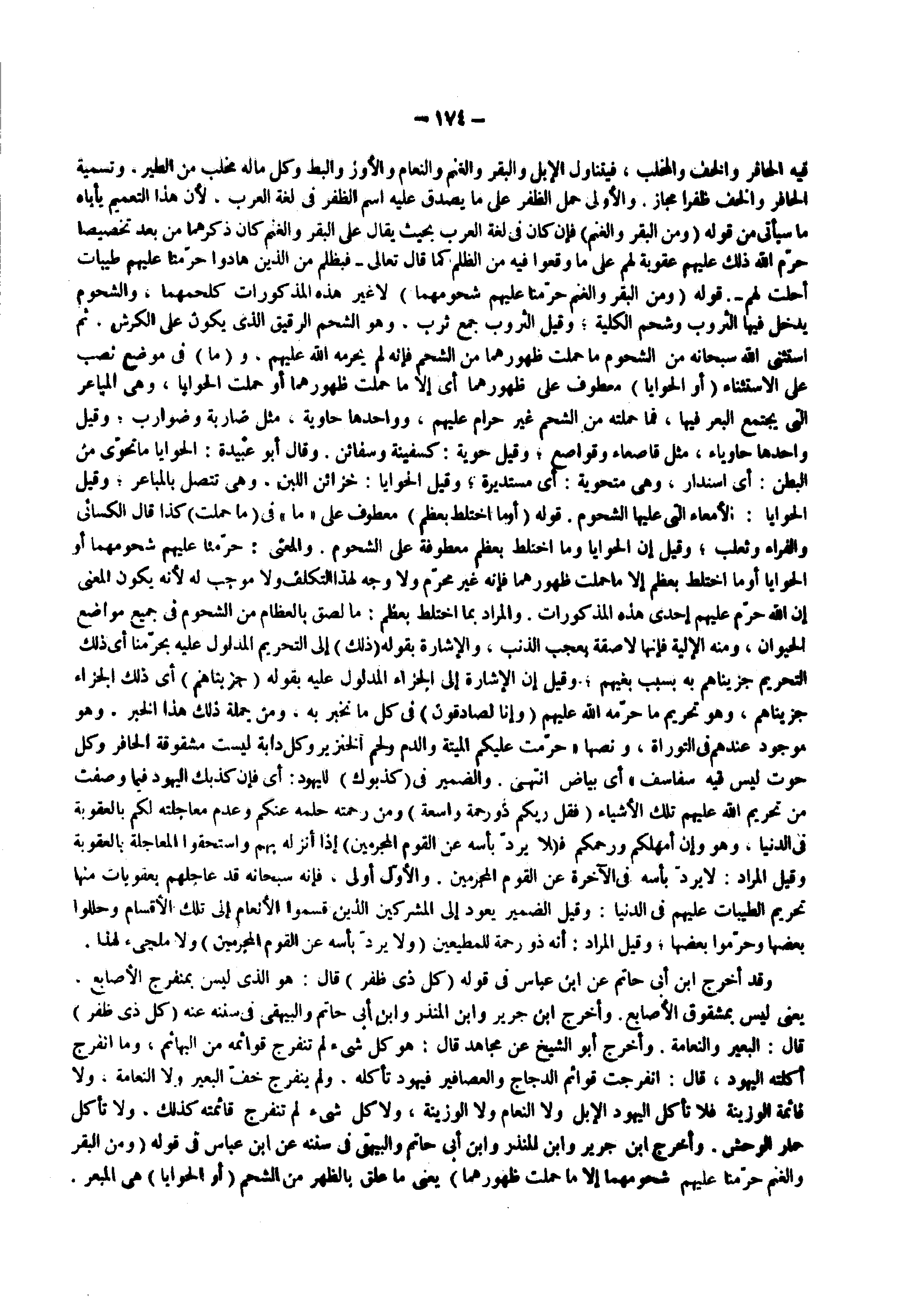 وقد أخرج ابن أبي حاتم عن ابن عباس فى قوله ) كل ذي ظفر ( قال هو الذى ليس بمنفرج الأصابع يعني ليس بمشقوق الأصابع وأخرج ابن جرير وابن المنذر وابن أبي حاتم والبيهقي فى سننه عنه ) كل ذي ظفر ( قال البعير والنعامة وأخرج أبو الشيخ عن مجاهد قال هو كل شيء لم تنفرج قوائمه من البهائم وما انفرج أكلته اليهود قال انفرجت قوائم الدجاج والعصافير فيهود تأكله ولم ينفرج خف البعير ولا النعامة ولا قائمة الوزينة فلا تأكل اليهود الإبل ولا النعام ولا الوزينة ولا كل شيء لم تنفرج قائمته كذلك ولا تأكل حمار الوحش وأخرج ابن جرير وابن المنذر وابن أبي حاتم والبيهقي فى سننه عن ابن عباس فى قوله ) ومن البقر والغنم حرمنا عليهم شحومهما إلا ما حملت ظهورهما ( يعني ما علق بالظهر من الشحم ) أو الحوايا ( هي المبعر