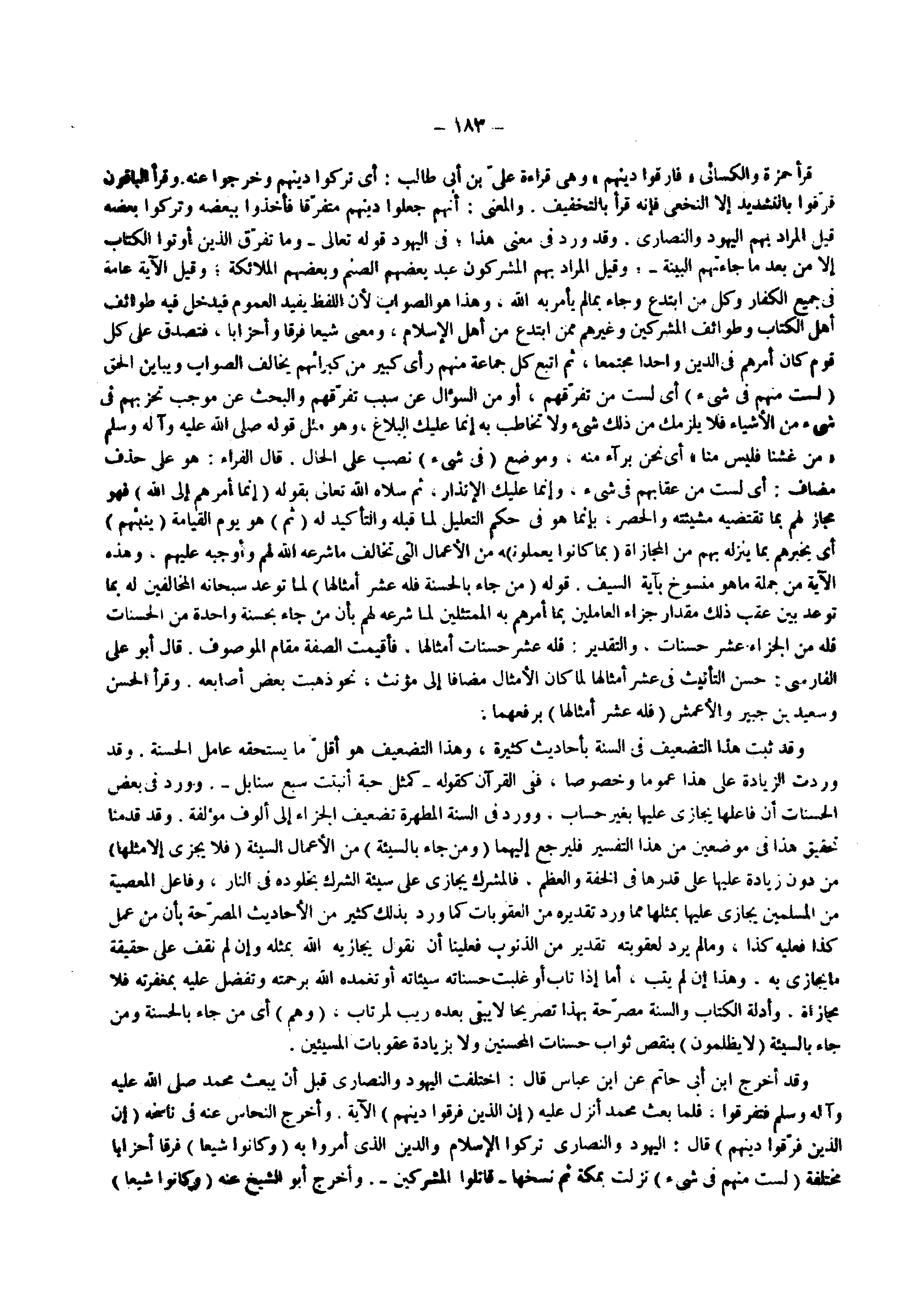 وقد أخرج ابن أبي حاتم عن ابن عباس قال اختلف اليهود والنصارى قبل أن يبعث محمد ( صلى الله عليه وسلم ) فتفرقوا فلما بعث محمد أنزل عليه ) إن الذين فرقوا دينهم ( الآية وأخرج النحاس عنه فى ناسخه ) إن الذين فرقوا دينهم ( قال اليهود والنصارى تركوا الإسلام والدين الذى أمروا به ) وكانوا شيعا ( فرقا أحزابا مختلفة ) لست منهم في شيء ( نزلت بمكة ثم نسخها ) فاقتلوا المشركين ( وأخرج أبو الشيخ عنه ) وكانوا شيعا (